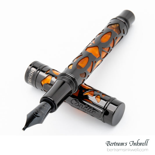 From 1660 to the late 19th century filigree was ornamental work made with grains or beads. It was very popular in Italy, France and Portugal as well as India and Asia. Today filigree/overlay is a form of intricate metalwork usually of fine wire of gold, silver, copper or metal, and is used to decorate various surfaces. Filigree can be applied to any ornamental openwork of delicate or intricate design. The beauty of filigree craftsmanship is undeniable. The first Deco Crest™ pens were manufactured by Conklin Pen Company back in 1905. Through the years the Deco Crest™ kept its place in Conklin’s collection by virtue of its beauty and durability. The Conklin Pen Company, originally released the ever successful Endura in 1924 and the Endura line continued to expand and grow. Based on the original models, the Endura has all the aesthetic design features which made the pen such a timeless classic. By combining these two famous models, today Conklin Pen Company is proud to introduce Endura Deco Crest™. The collection is available in three gorgeous colors (blue, black and orange) with three finishes (rose gold, chrome and gunmetal). Crafted from hand-made European high-grade, hand-turned and hand-polished resin and accented with metal overlay, the barrel brilliantly reflects light off of its surface, enhancing the stunning colors. Lustrous plating adorns the clip, band, trim and overlay, enhancing the elegance of each Endura pen. The collection is available in Fountain and Ballpoint pen.