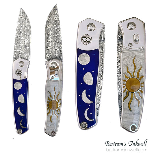 The Blade on the Celestial Folding Knife is forged using Swedish Stainless (Damasteel DS93X) Damascus and a diamond is set in each side of the silver thumb stud.