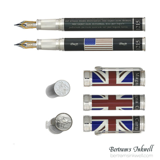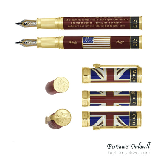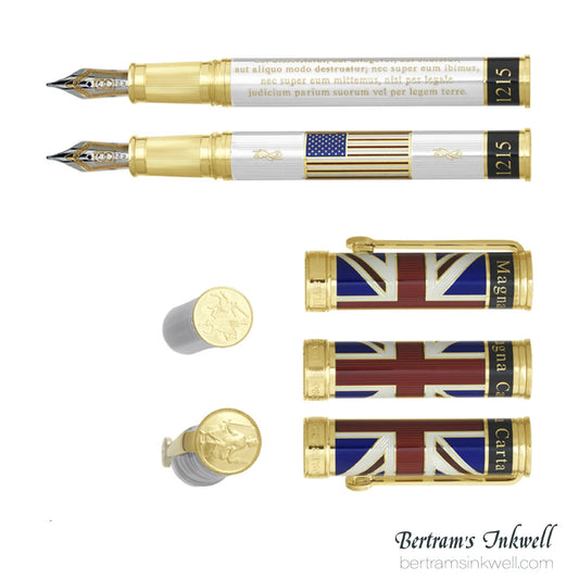 Each pen cap features the British Flag (Union Jack), in translucent hard enamel; each pen barrel features the American flag (Old Glory) in opaque hard enamel. Crowning each pen cap is the primary seal of King John, which was used to authenticate the document in 1215; the secondary seal is located at the base of the pen barrel. Positioned at the base of the clip is the familiar symbol of the scale of justice.