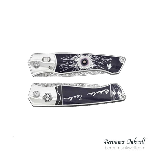 Hand-crafted in solid Sterling Silver and Stainless Damascus, the Tesla collection incorporates elements of the inventor’s inventions thoughts and ideas. Nikola Tesla’s signature is prominently displayed in high relief on the knife scale, along with a rotating magnetic field and the symbol for Alternating Current. The Tesla Coil is seen in the background, engraved in low relief. High relief electricity juxtaposes a low relief X-Ray of Tesla’s hand in the low relief coil in the background. Appropriately, Tesla’s beloved white pigeon is featured in white enamel.
