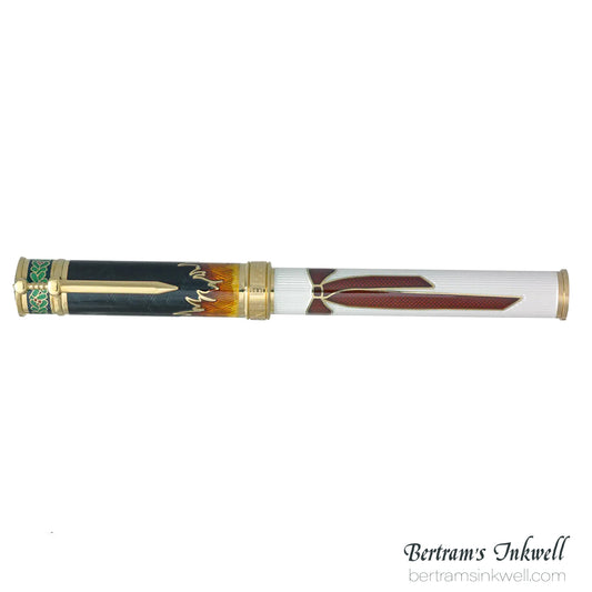 The Sankta Lucia Collection is the 26th in the David Oscarson series of Limited Edition Writing Instruments, Ancient symbols of Lucia are represented in the Sankta Lucia design, including her white robe and red sash on the barrel, a Roman sword for the clip and the Roman Numeral XIII at the base of the barrel. Contrasting smoke and flames are featured on the cap in guilloche and hot enamel. The lingonberry wreath and candles are depicted on the gripping section and top of the cap and a Diamond-set burst of light appears at the top of the crown.