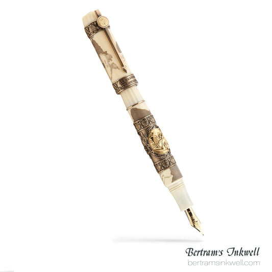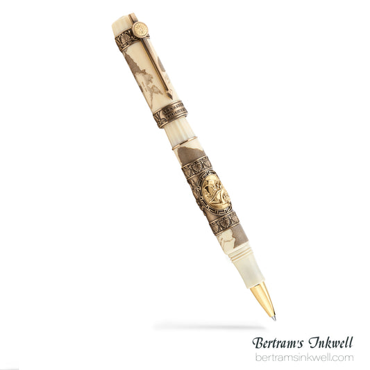 Visconti crafts this incredible collection with a cylindrical shape, including carved details reminiscent of Greek columns. The map of Alexander the Great's empire, created by scrimshaw technique is darkened to make the depiction stand out against the ivory colored resin on the barrel and cap. The metal fittings are in aged bronze and feature typical Greek decorations.