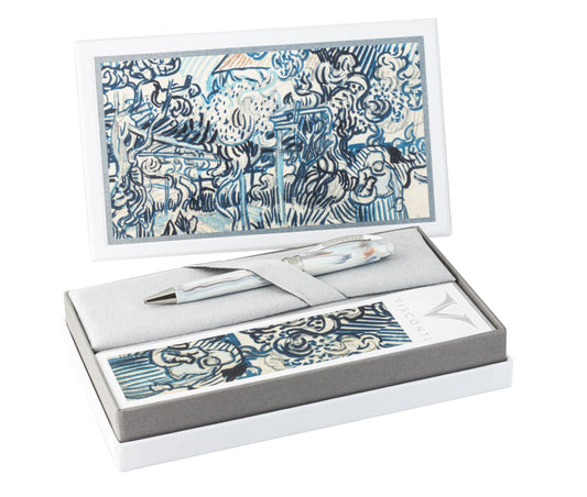 The “Old vineyard with peasant woman” edition is presented in an elegant white box with a new Visconti logo and a picture of the Van Gogh painting it is dedicated to. The combination of white, grey and blue shades recalls winter motives and the festive season. The pen itself utilizes Visconti's eighteen-faceted design, the many edges enhancing the vivid colors of the pen.