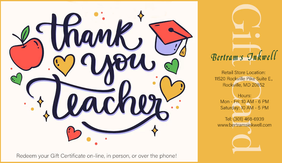 A teacher appreciation gift card is often given as a present because it allows the recipient to choose exactly what they want to buy from Bertram's Inkwell, providing flexibility and ensuring they get something they will actually use, especially when you might not know their exact tastes or needs very well; it's a convenient way to give a thoughtful gift without the guesswork of picking out a specific item.