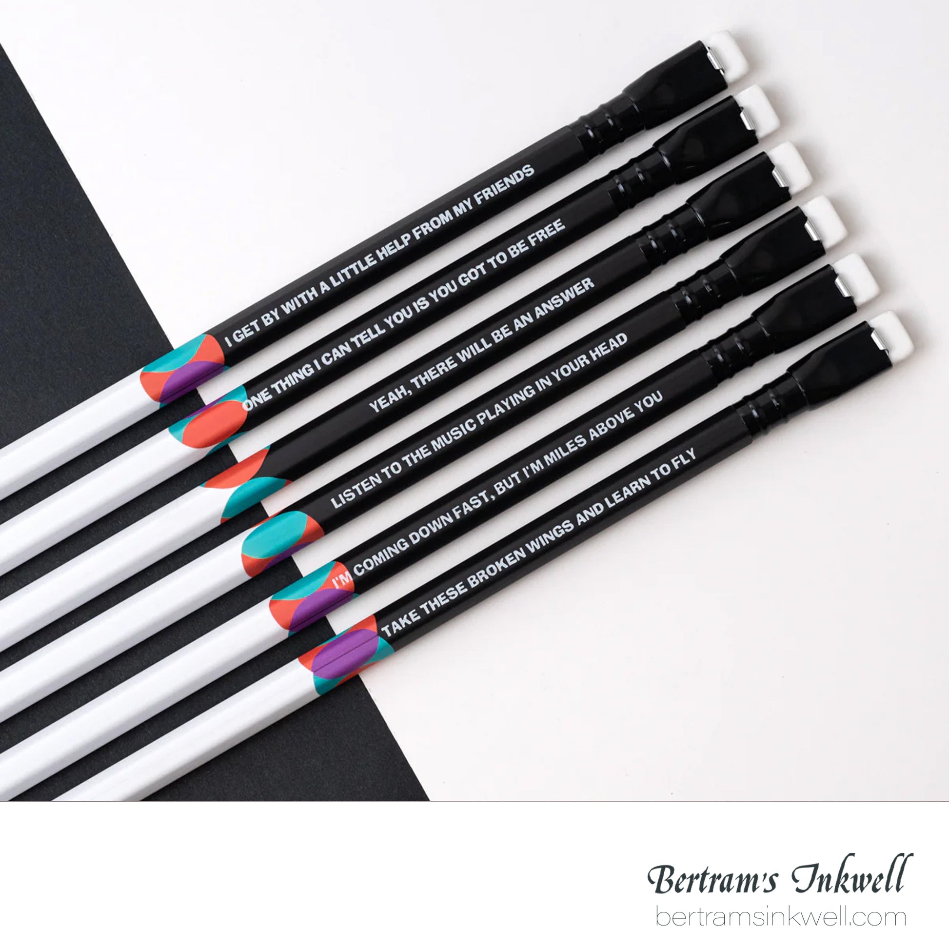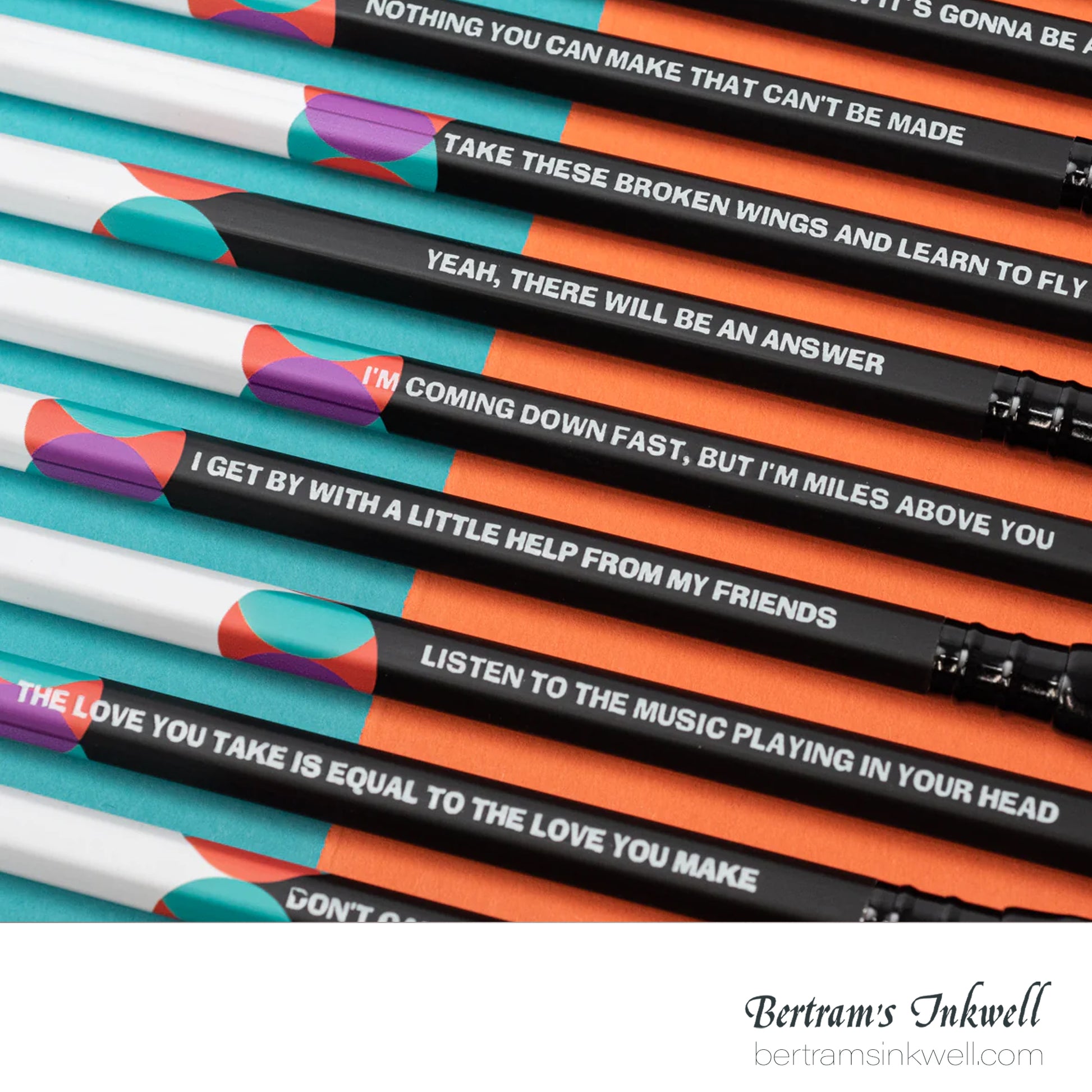 Blackwing 192 is a tribute to Lennon and McCartney and the estimated 192 songs they wrote together. The color prism design depicts the convergence of two powerful creative forces. A different Lennon-McCartney lyric is foil stamped on each pencil, for a total of twelve different lyrics in the set. Each pencil contains our extra-firm graphite.