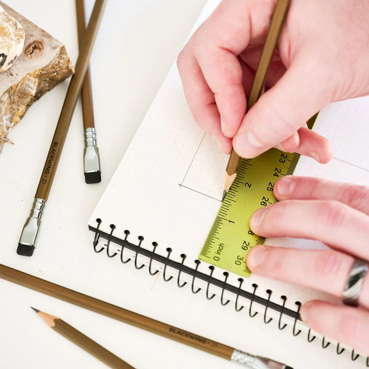 The Blackwing 21 is our tribute to the craft of woodworking. Each pencil is made with special finger jointed slats created by combining two short slats together. It also features our first-ever square barrel with an extra wide face so you can see the finger joints on each pencil. The number 21 represents the wisdom of "measure twice, cut once." The pencil’s firm graphite is perfect for measuring and marking cut lines, and then measuring them again.