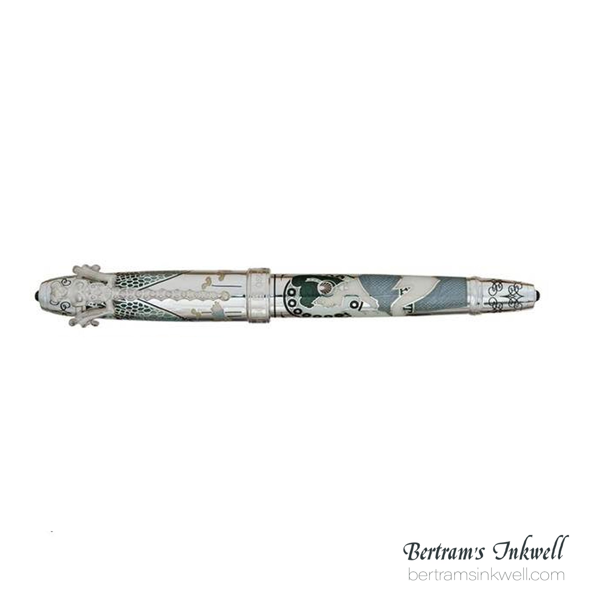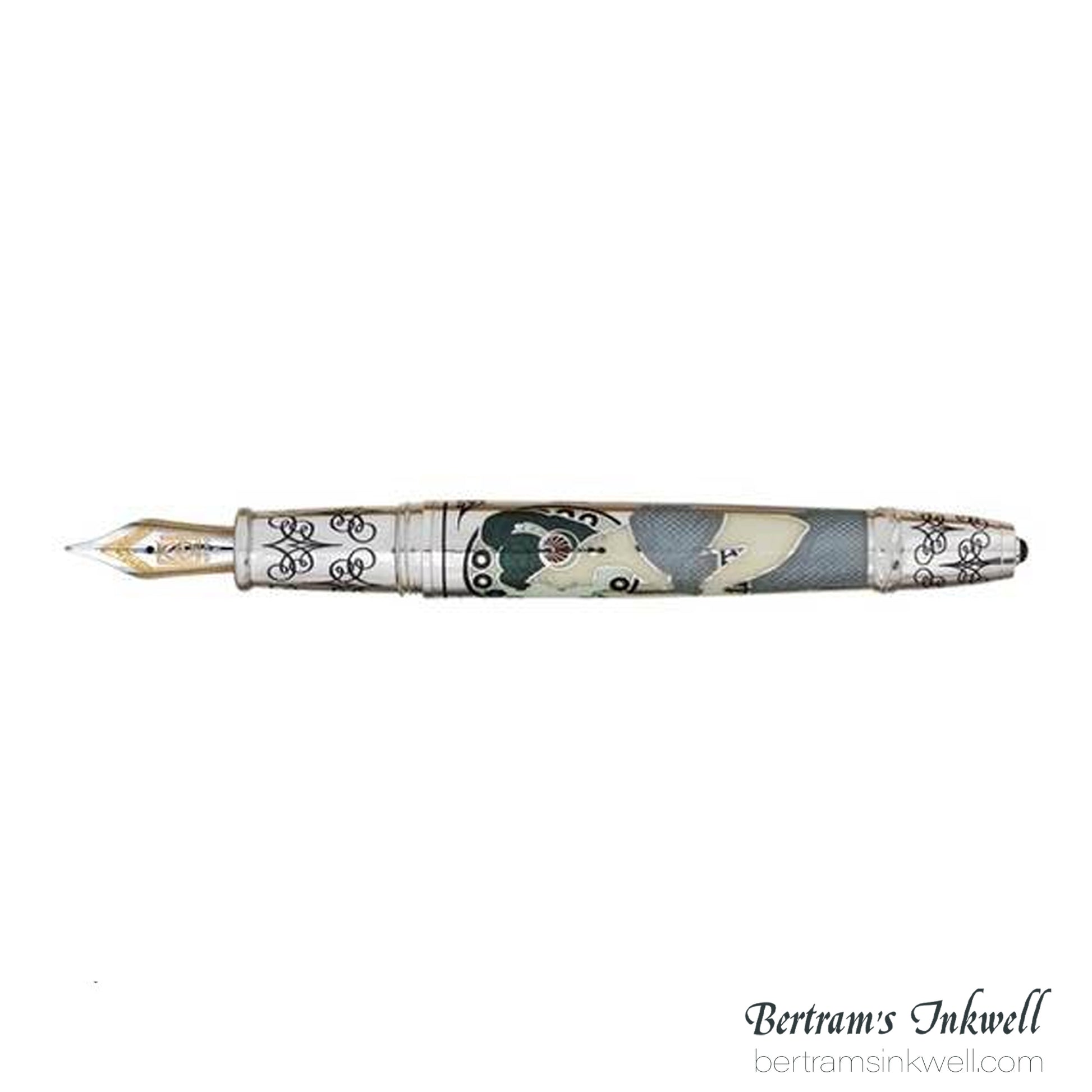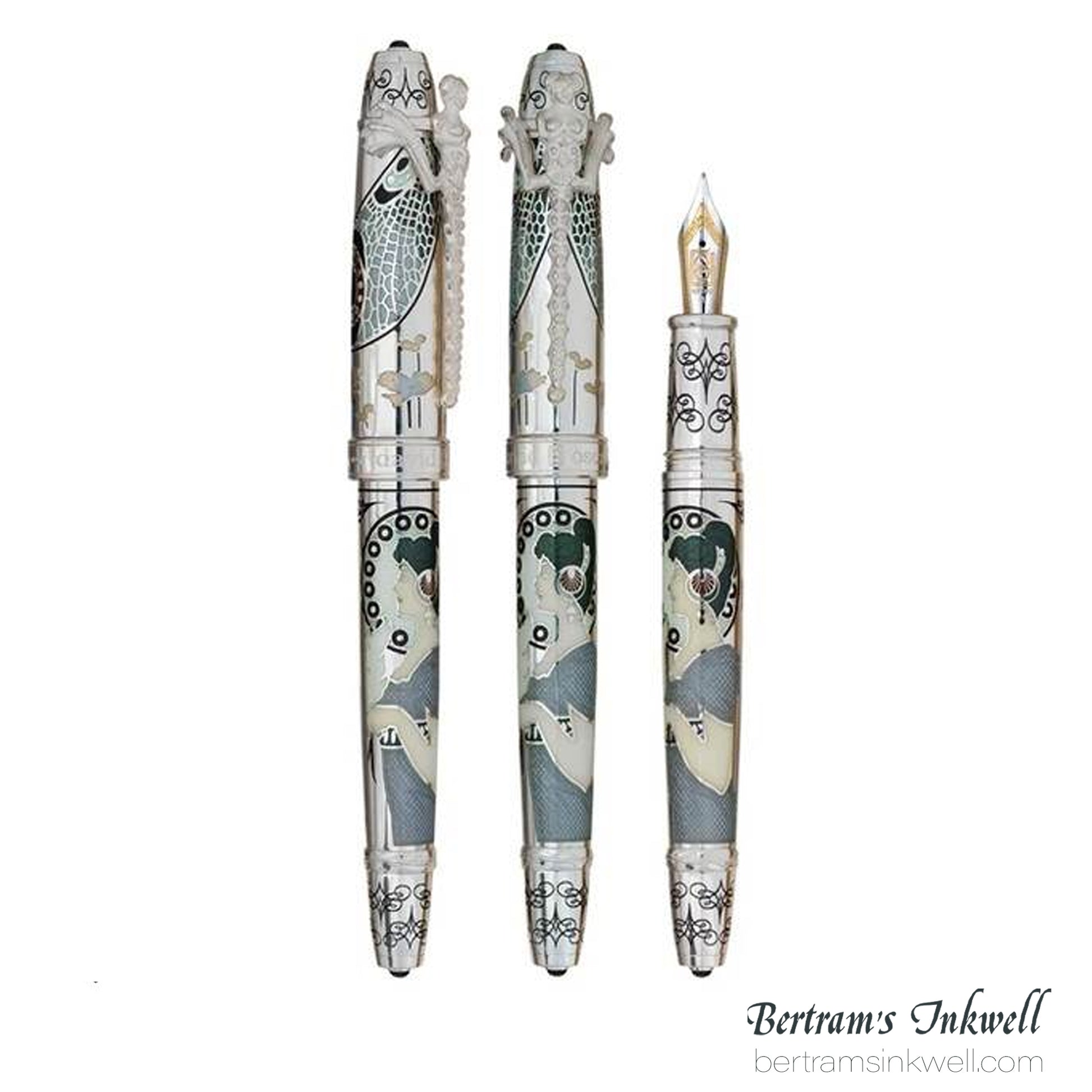 Sarah Bernhardt, and shown at the World’s Fair in Paris in 1900. The artwork featured on the barrel is a recreation of Alphonse Mucha’s masterpiece entitled La Plume (the pen) from 1899. Each gripping section features inlaid opaque hard enamel and a cabochon onyx adorns the top and bottom of each Collection piece.
