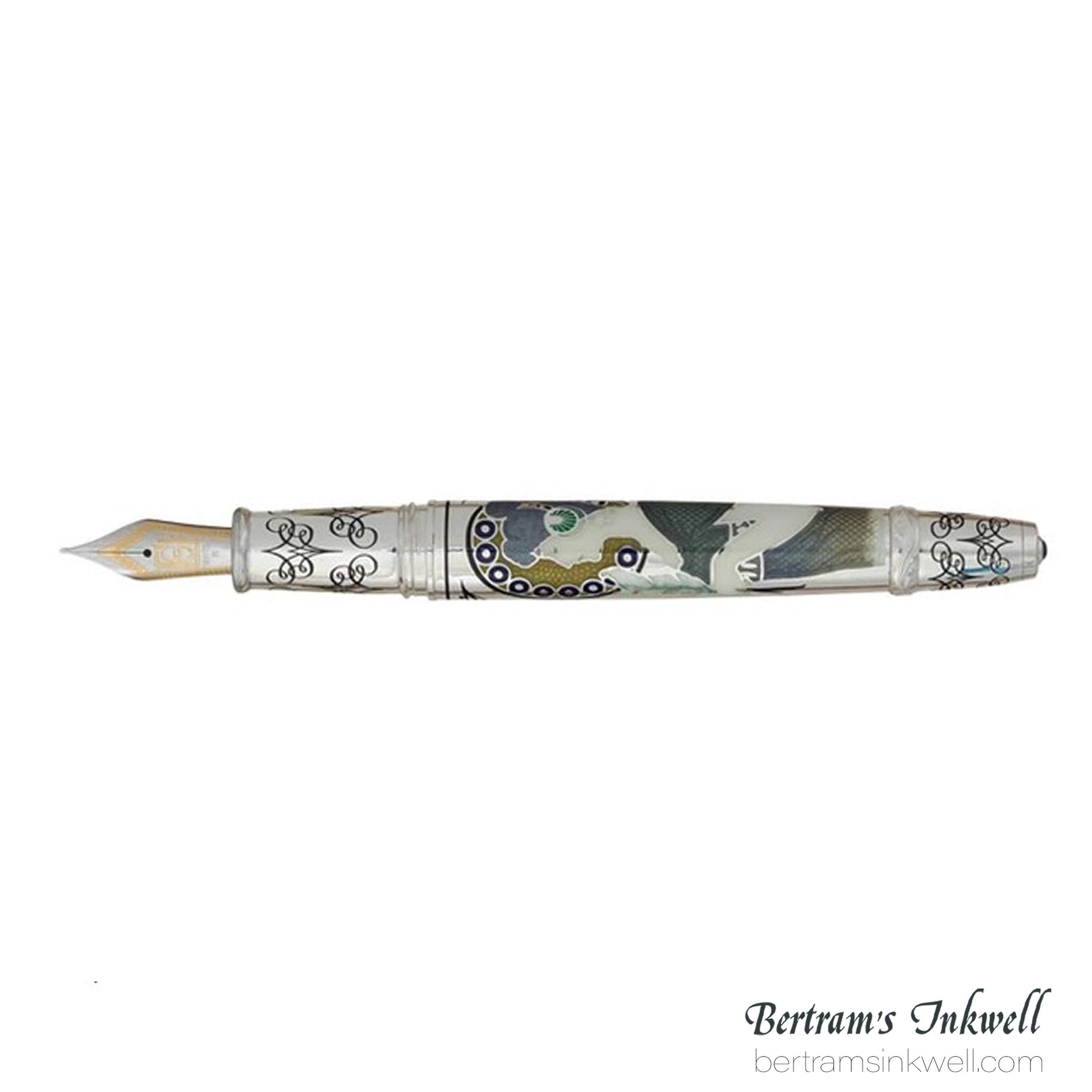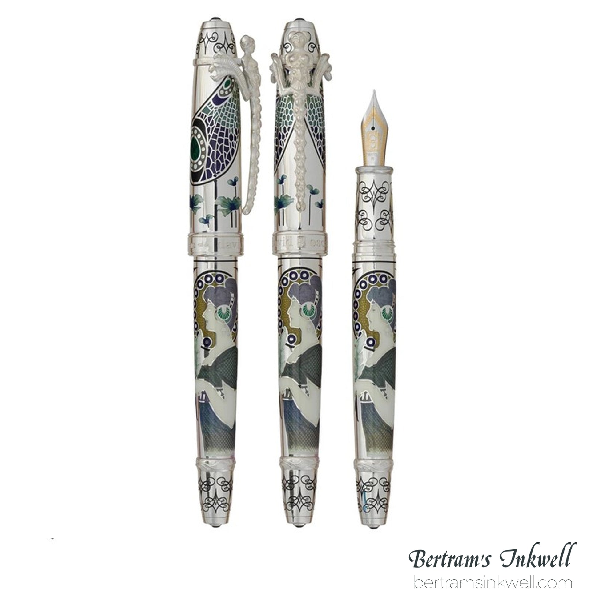 Sarah Bernhardt, and shown at the World’s Fair in Paris in 1900. The artwork featured on the barrel is a recreation of Alphonse Mucha’s masterpiece entitled La Plume (the pen) from 1899. Each gripping section features inlaid opaque hard enamel and a cabochon onyx adorns the top and bottom of each Collection piece.