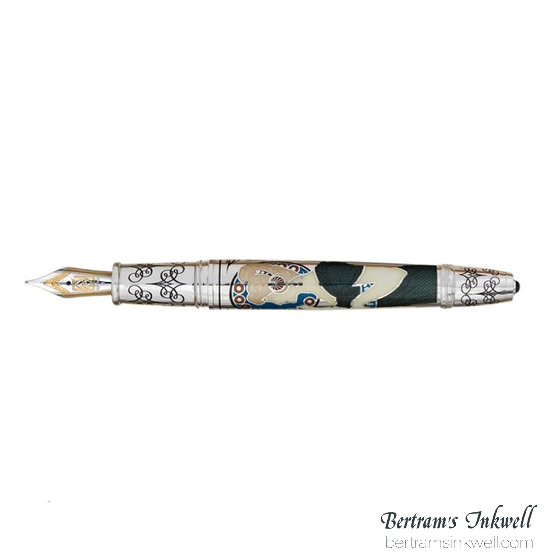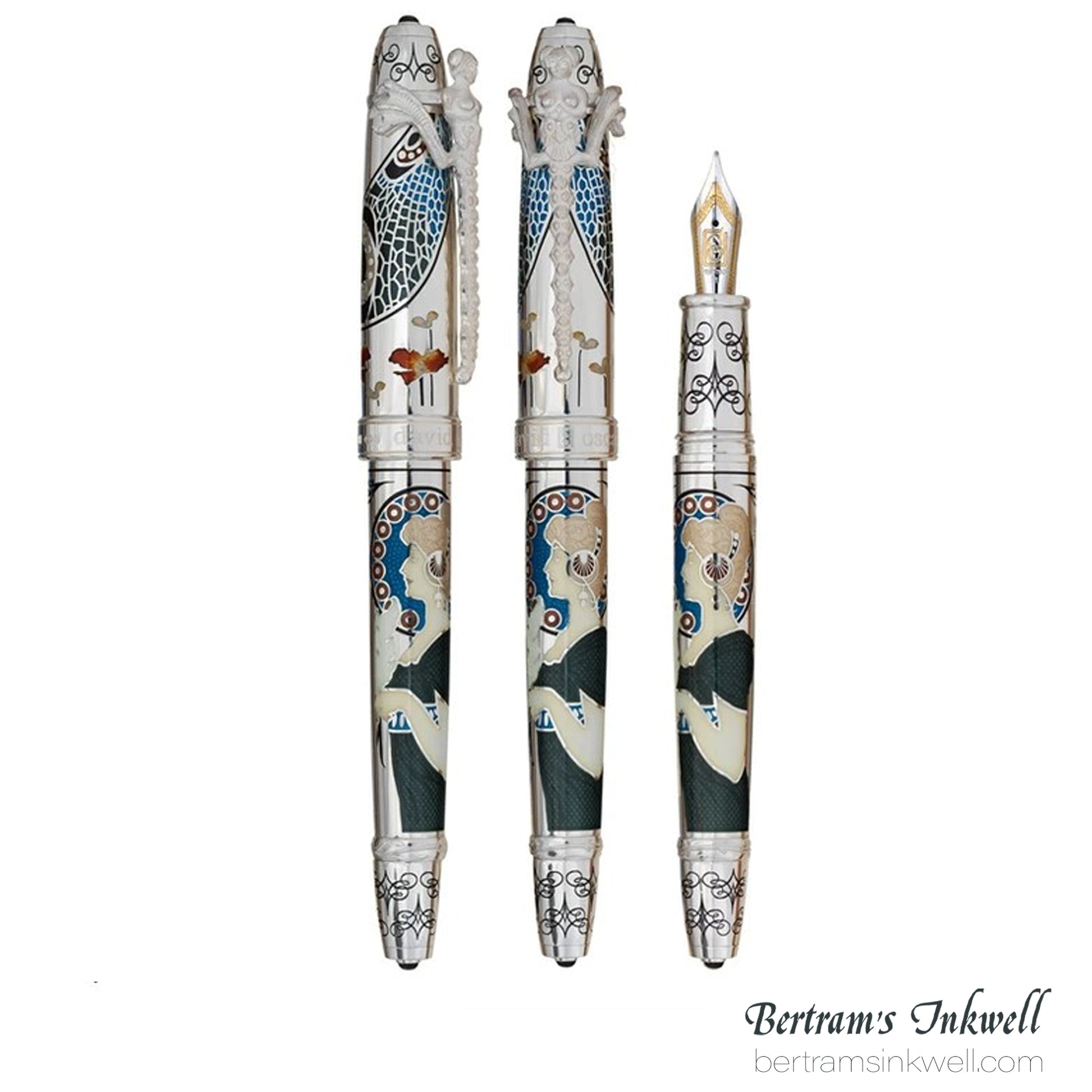 Sarah Bernhardt, and shown at the World’s Fair in Paris in 1900. The artwork featured on the barrel is a recreation of Alphonse Mucha’s masterpiece entitled La Plume (the pen) from 1899. Each gripping section features inlaid opaque hard enamel and a cabochon onyx adorns the top and bottom of each Collection piece.