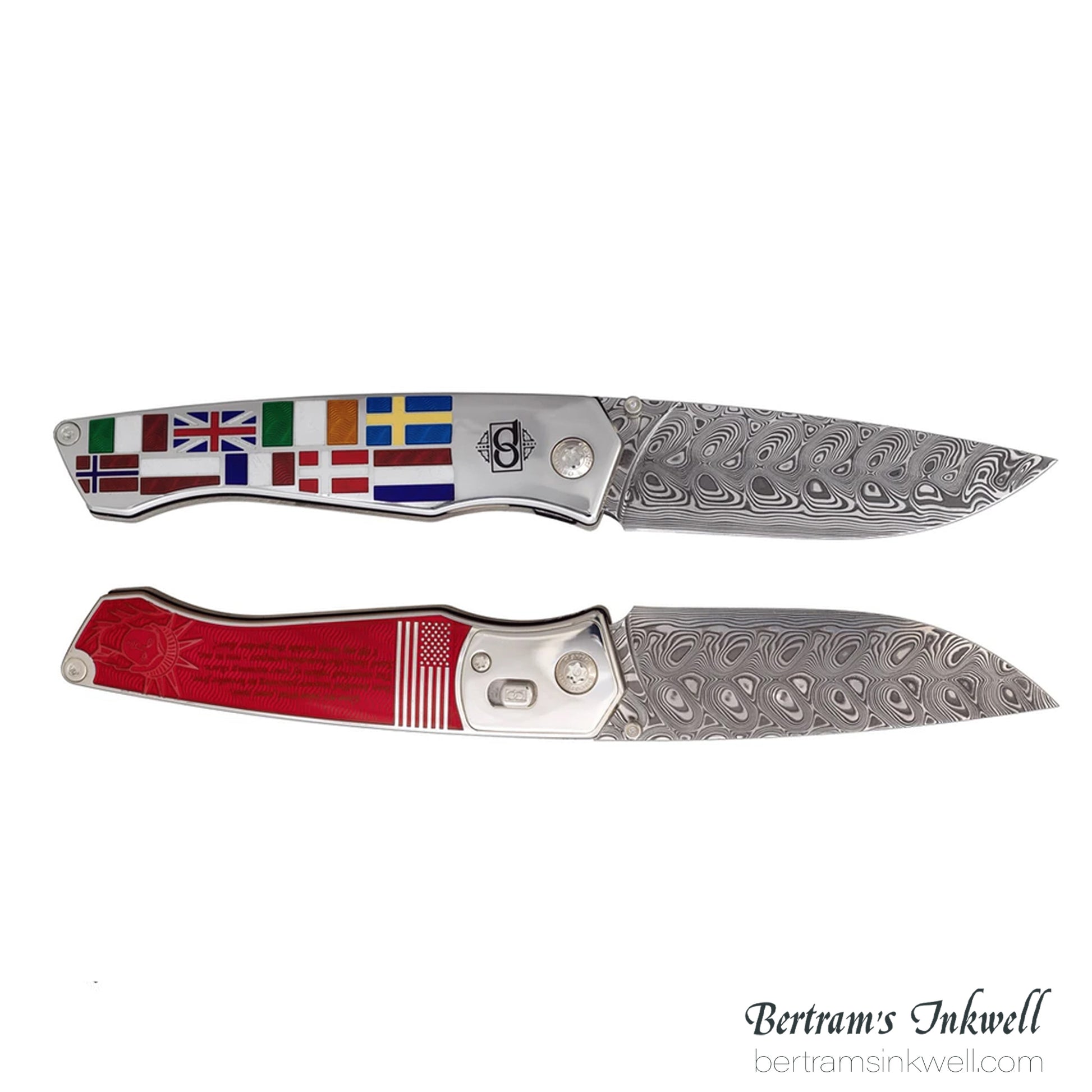 The Blade on the Ellis Island Folding Knife is forged using Swedish Stainless (Damasteel DS93X) Damascus and a diamond is set in each side of the silver thumb stud.
