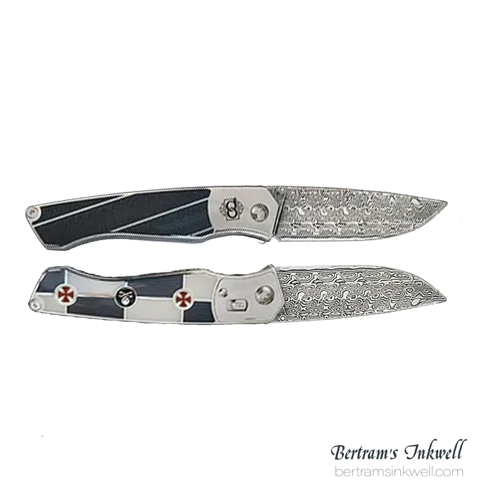 The Blade on the Jacques deMolay Folding Knife is forged using Swedish Stainless (Damasteel DS93X) Damascus and a diamond is set in each side of the silver thumb stud.