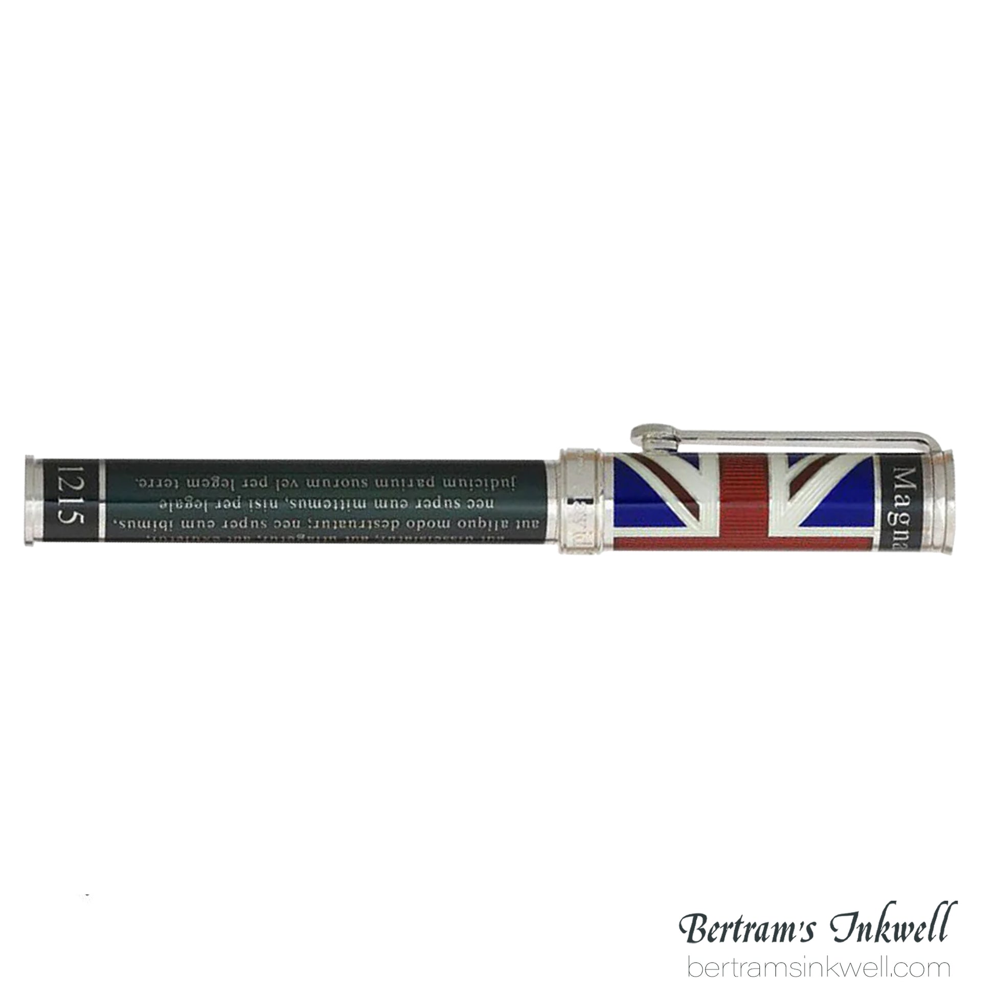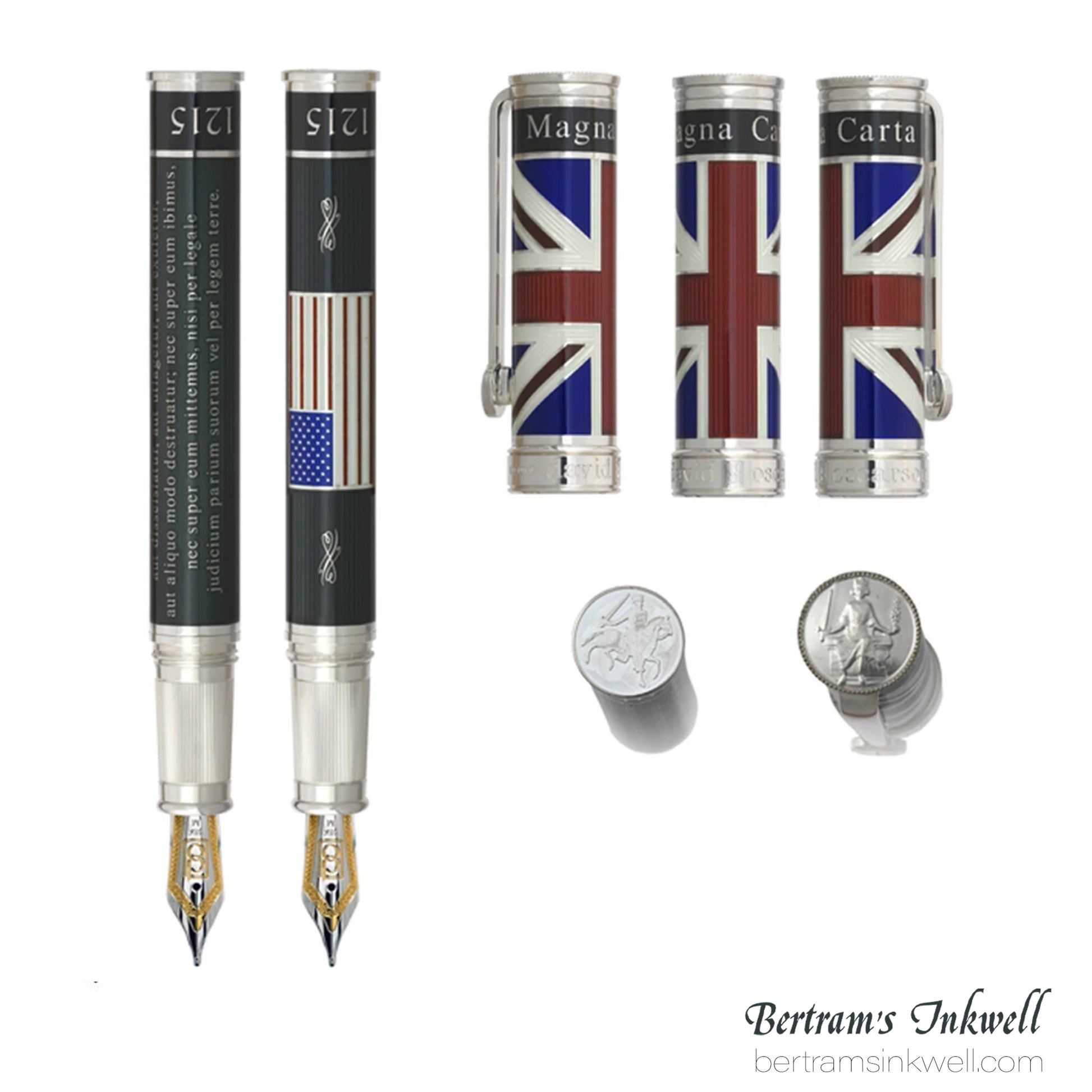 Each pen cap features the British Flag (Union Jack), in translucent hard enamel; each pen barrel features the American flag (Old Glory) in opaque hard enamel. Crowning each pen cap is the primary seal of King John, which was used to authenticate the document in 1215; the secondary seal is located at the base of the pen barrel. Positioned at the base of the clip is the familiar symbol of the scale of justice.