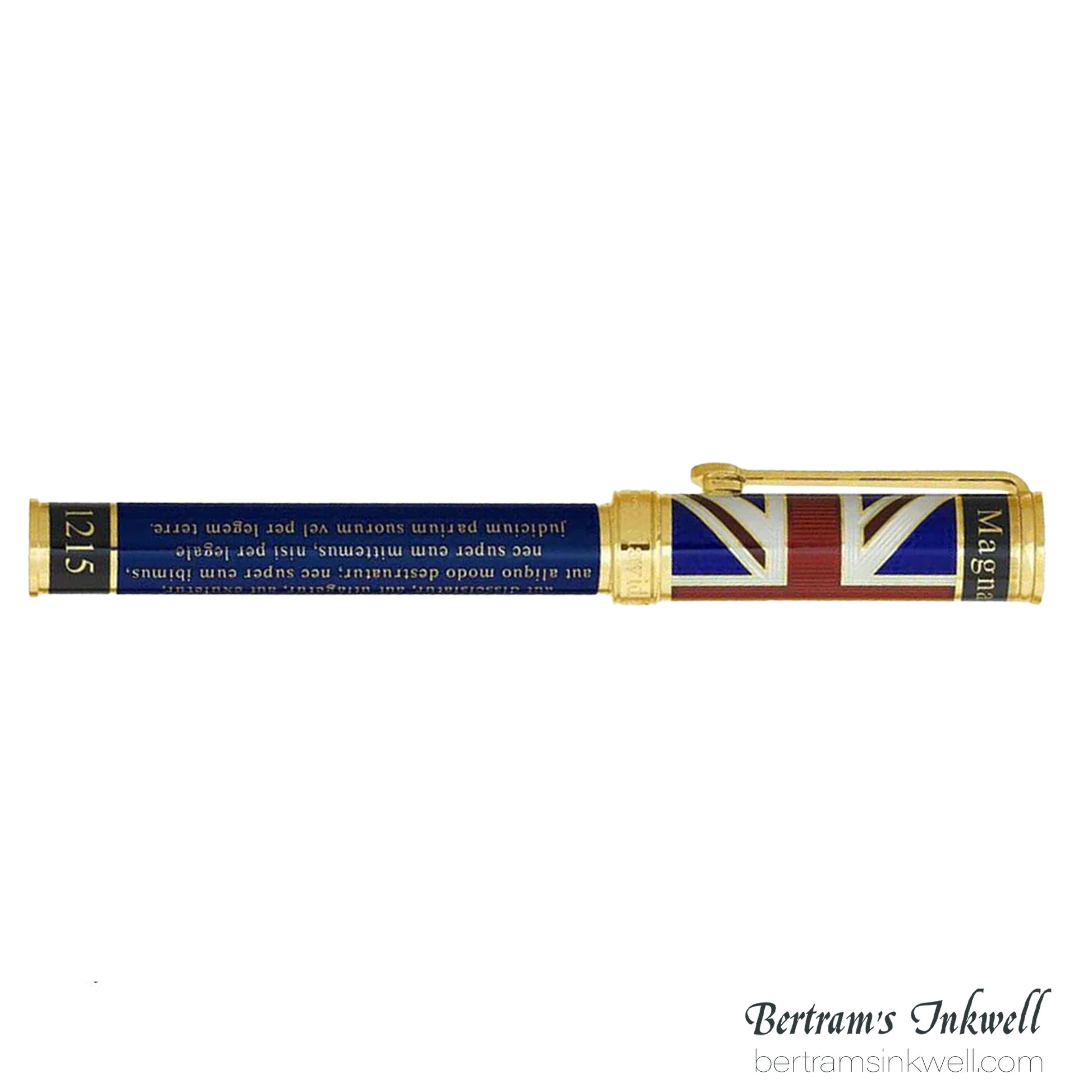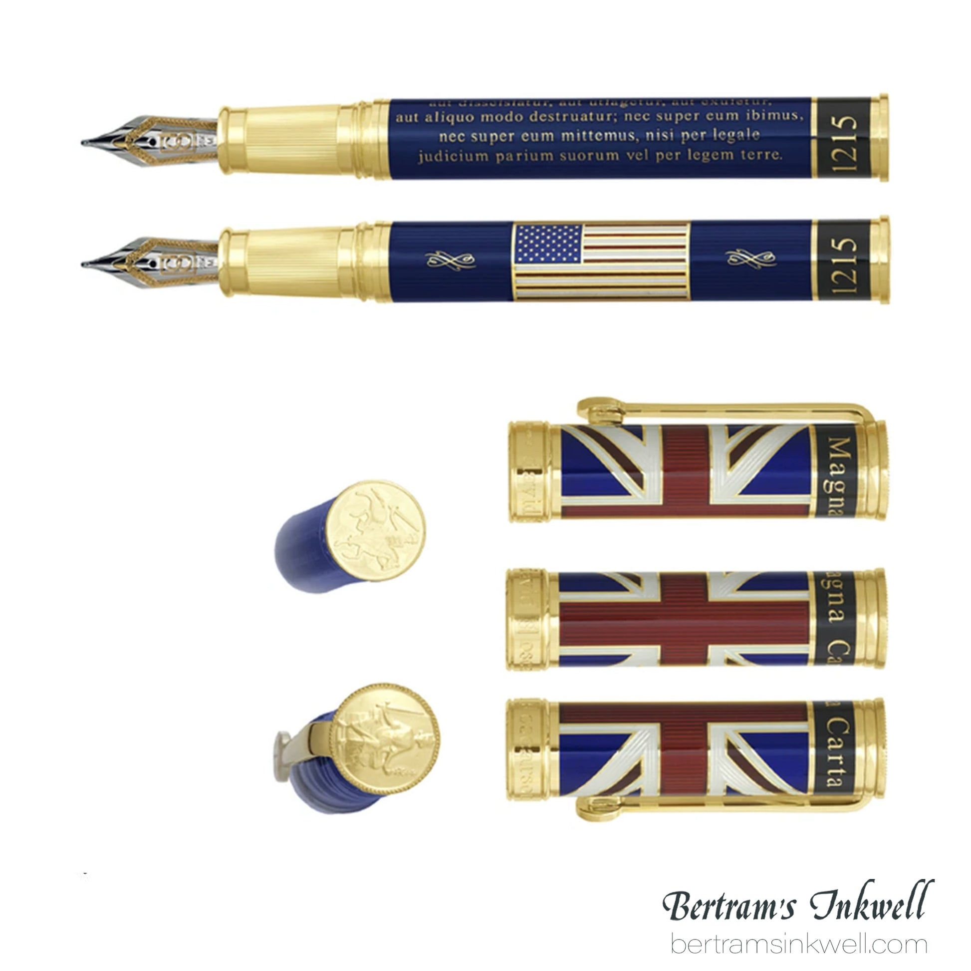 Each pen cap features the British Flag (Union Jack), in translucent hard enamel; each pen barrel features the American flag (Old Glory) in opaque hard enamel. Crowning each pen cap is the primary seal of King John, which was used to authenticate the document in 1215; the secondary seal is located at the base of the pen barrel. Positioned at the base of the clip is the familiar symbol of the scale of justice.