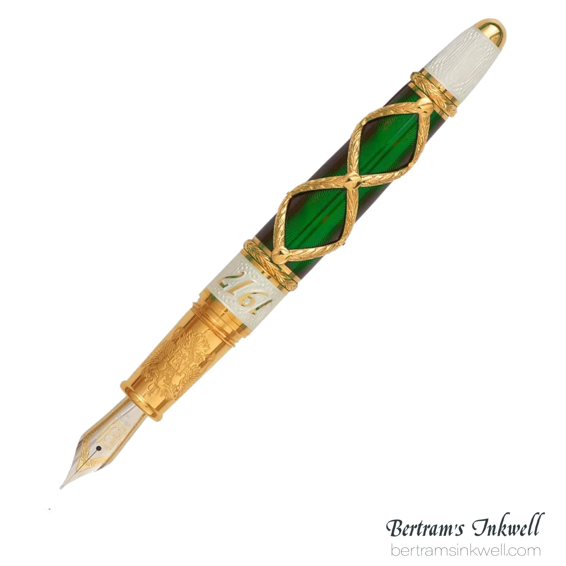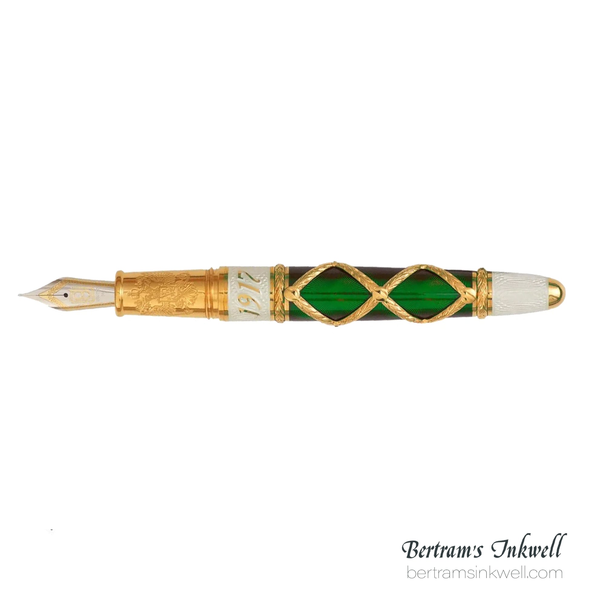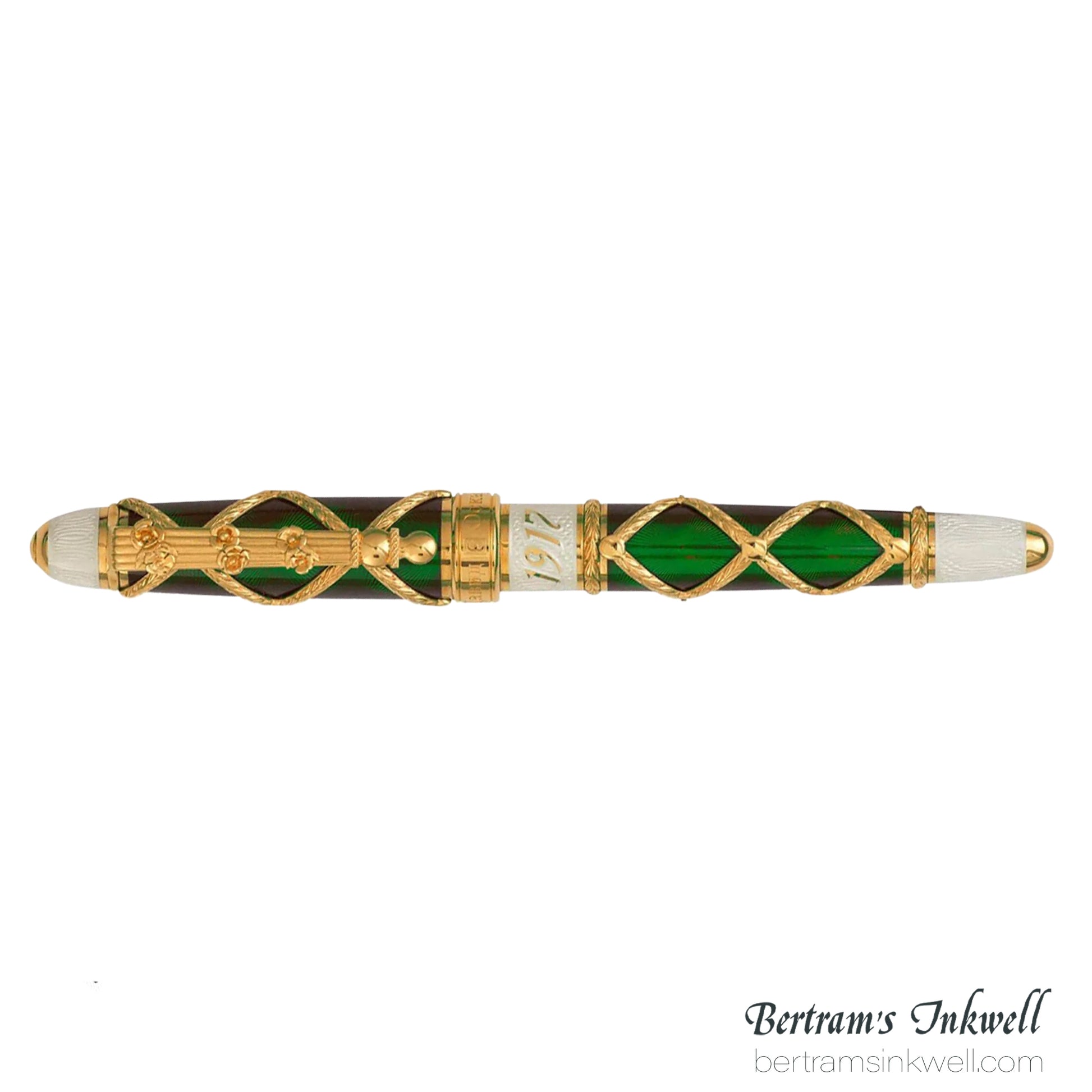 Crafted from solid Sterling Silver, the cap and barrel feature repeating Guilloché sunbursts overlaid with interlocking double-leaf accoutrements reminiscent of the 1896 Coronation Egg commemorating the 1896 coronation of Nicholas II. Two double-headed eagles adorn the gripping section and the clip is ornamented with three pairs of floral rosettes.