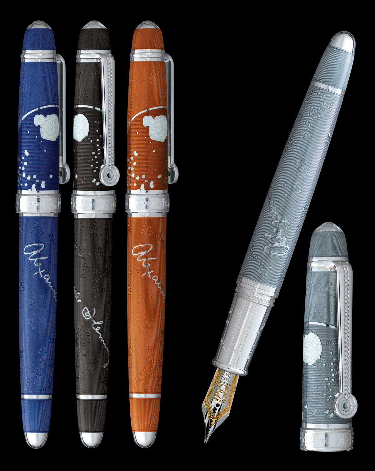 As with all David Oscarson Collection pieces, the Alexander Fleming Collection is created by combining the expertise of Guilloché engraving with the artistic mastery of Hard Enamel. The Alexander Fleming Collection is the twenty-third in the David Oscarson™ series of Limited Edition writing instruments and will be produced in three primary color variations, each limited to production of 73 pieces (including fountain pens and roller balls).
