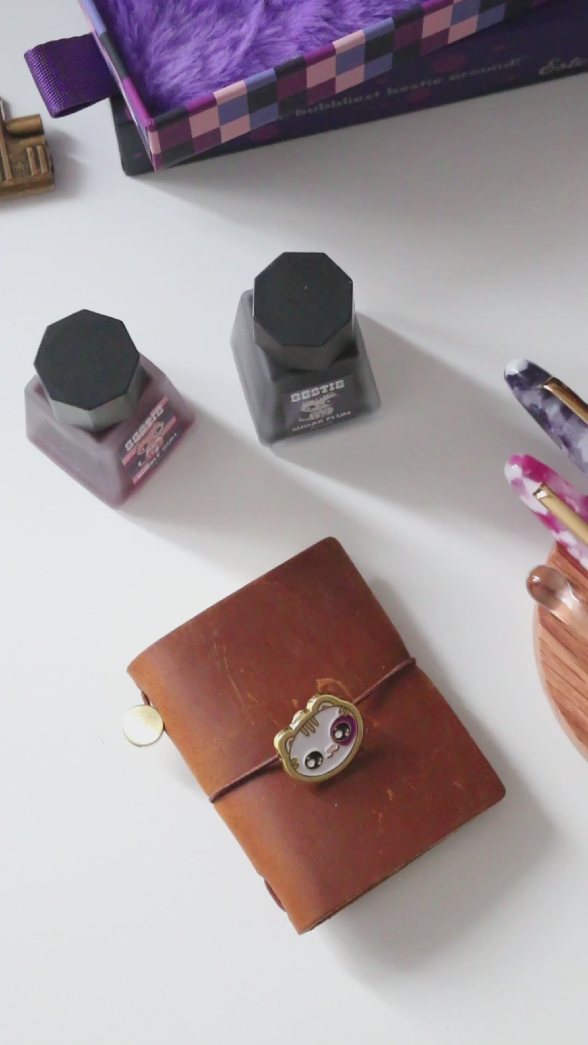 Purchase both Bestie fountain pens and receive the Bestie accessory collectibles (while supplies last) as a special gift—a perfect way to share one pen with your Bestie or enjoy the full Bestie experience together. The accessory set includes fountain pen inks in grape purple and fuchsia pink, a coordinated washi tape set (four rolls in one tube), embroidered pencil pouches in pink and purple, a Bestie key chain, and a fun sticker set.