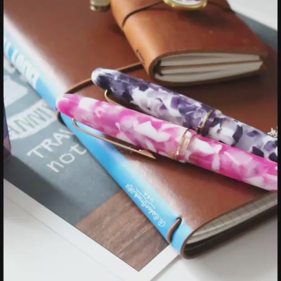 The Esterbrook Bestie Collection celebrates friendship, fun, and a shared love of pinks and purples through two joyful fountain pens: Bubble Gum Pink and Sugar Plum Purple. Bubble Gum Pink blends deep pinks, fuchsia, and soft whites for a lively yet balanced look, while Sugar Plum Purple features a dark, grape-toned purple accented with delicate white flecks for depth and whimsy.