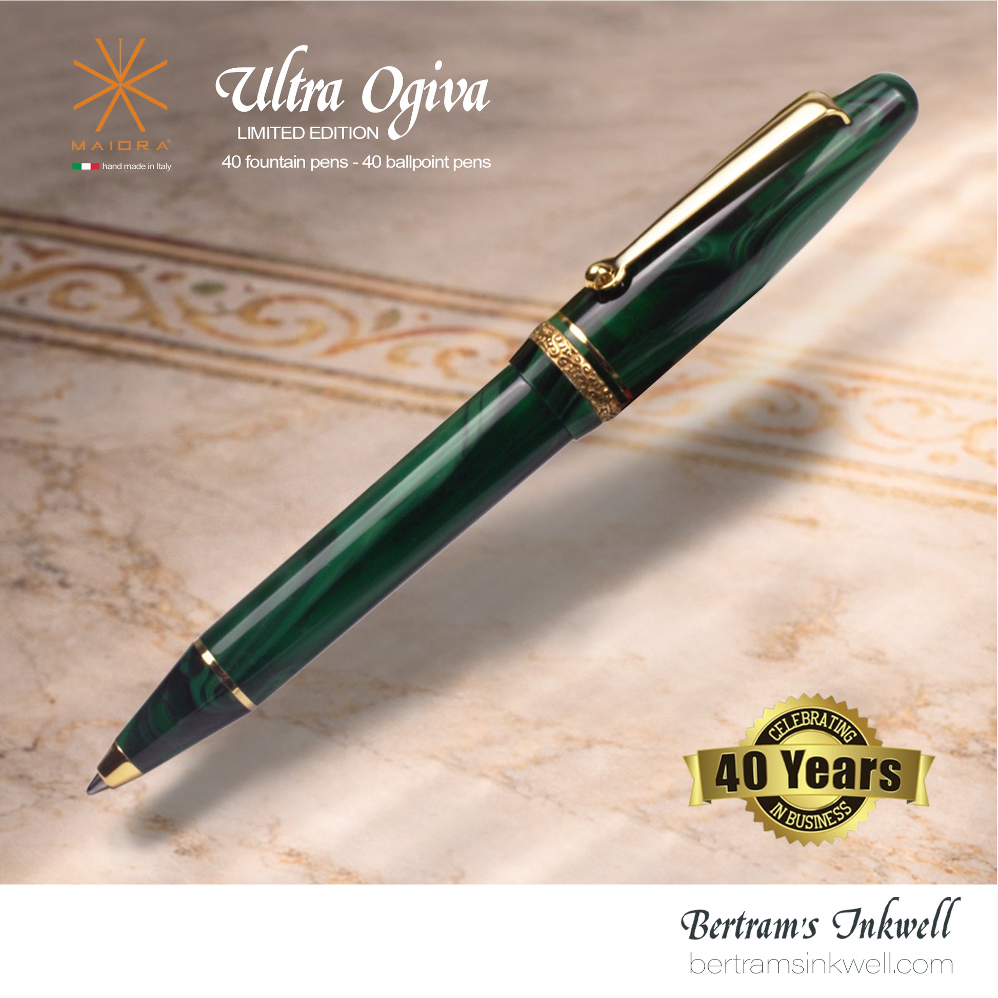 Maiora Ultra Ogiva Golden Age 2.0 Bertram's Inkwell 40th Anniversary Ballpoint is a new frontier, a new look, and a new work of art, entirely handmade in Italy.