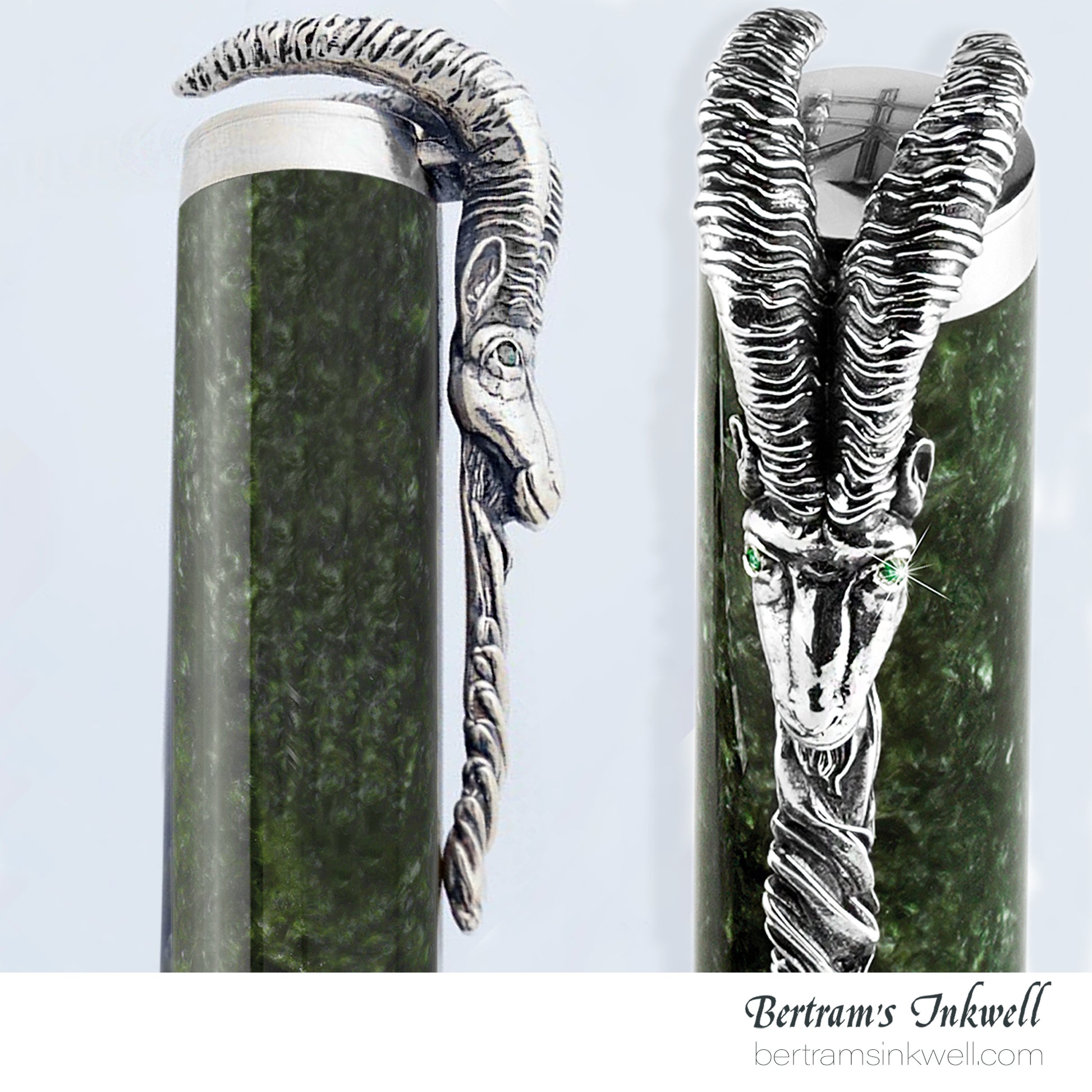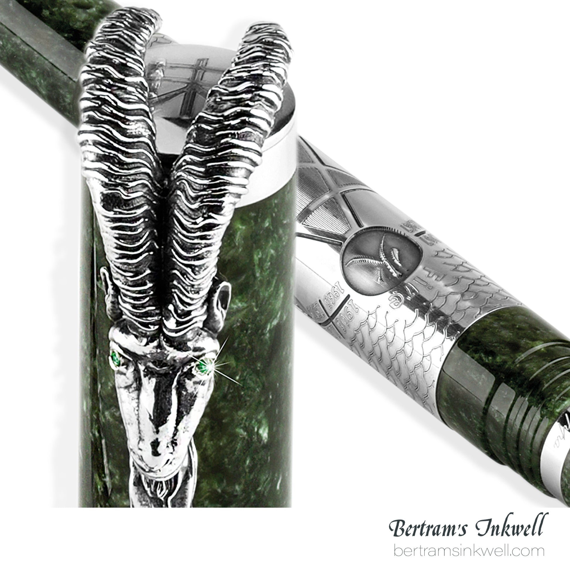 Montegrappa’s Year of the Goat 2015 is made of a pearl green resin barrel and cap with engraved sterling silver around the barrel with engraving of the five elements consist of Fire, Earth, Metal, Water and Wood and a goat head with eyes highlighted by emeralds as clip.