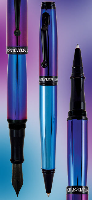 Designed after the astronomical light-shows that our galaxy displays, the Invincia Nebula features a distinct multi-colored plating finish, displaying a blend of metallic blues, purples, and reds. The sophistication of the trim, clip and nib in stark black contrasted with that of the barrel and cap, the Invincia Nebula is Monteverde's most alluring collection yet. Made from solid brass and assembled by hand, this mid-weight pen is ergonomically balanced and is comfortable to hold, perfect for daily writing. Soar through the stars and galaxies with the all new Invincia Nebula collection. Each finish is unique and one-of-a-kind. The fountain pen fills with standard international ink cartridges or converter. The stainless steel nib is available in fine, medium, broad and stub sizes.