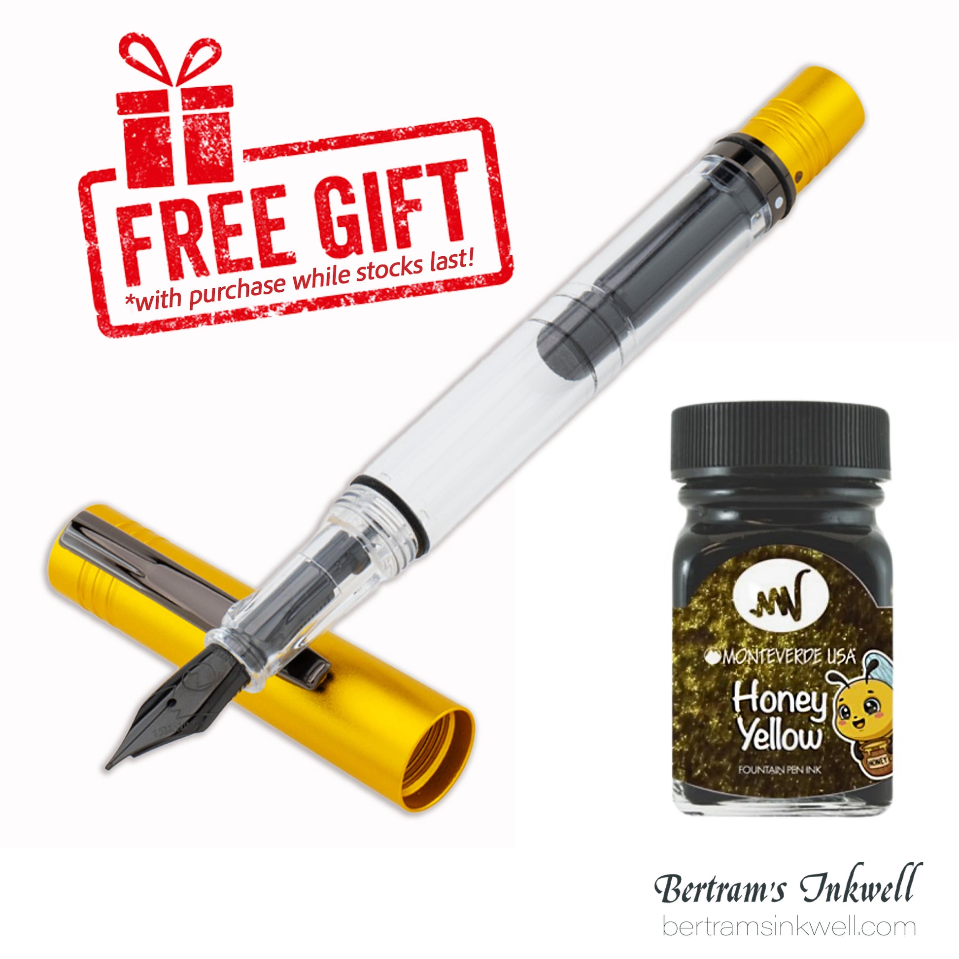 New MP1 color Honey Yellow fountain pen. Free with purchase, the Monteverde Honey Yellow Black & Gold Shimmer 30ml ink - while stocks last!