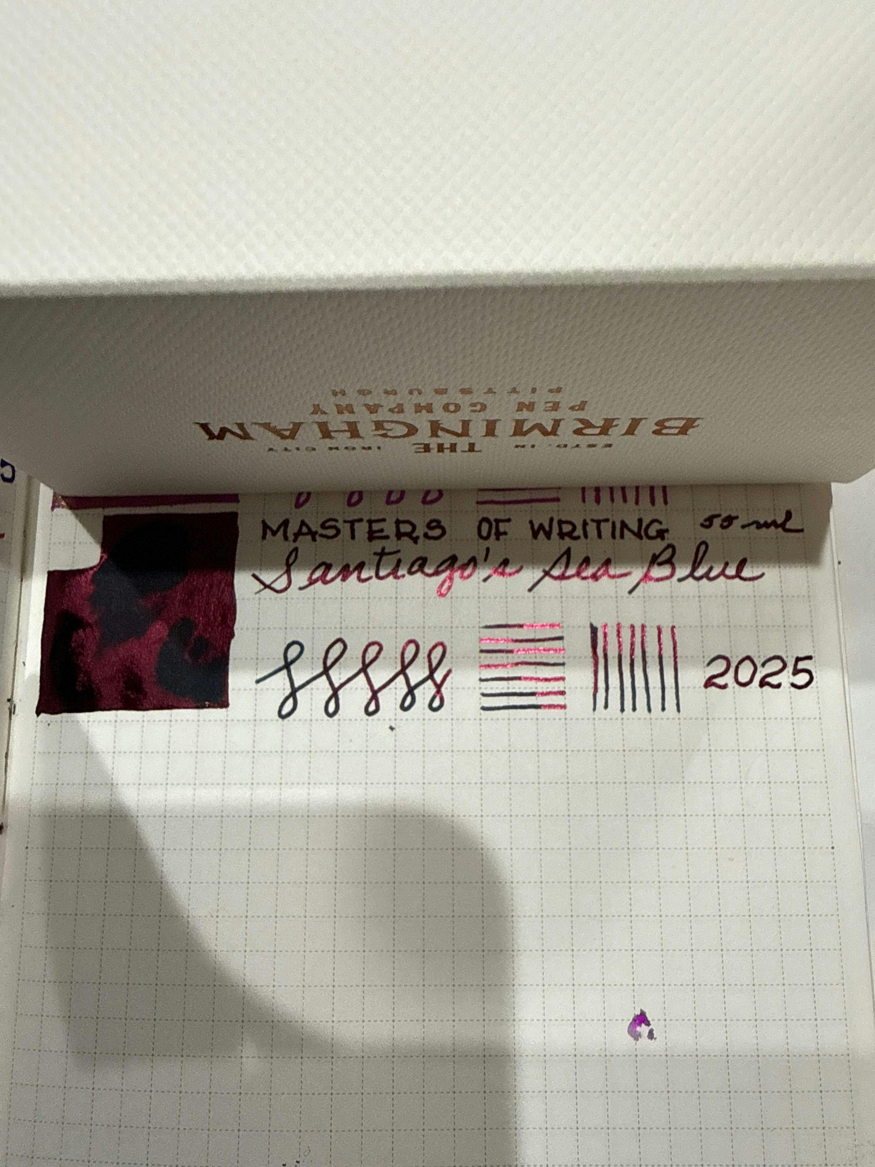 Santiago's Sea Blue is a deep, rich ink with an impressive sheen, highlighting red, purple, and teal.