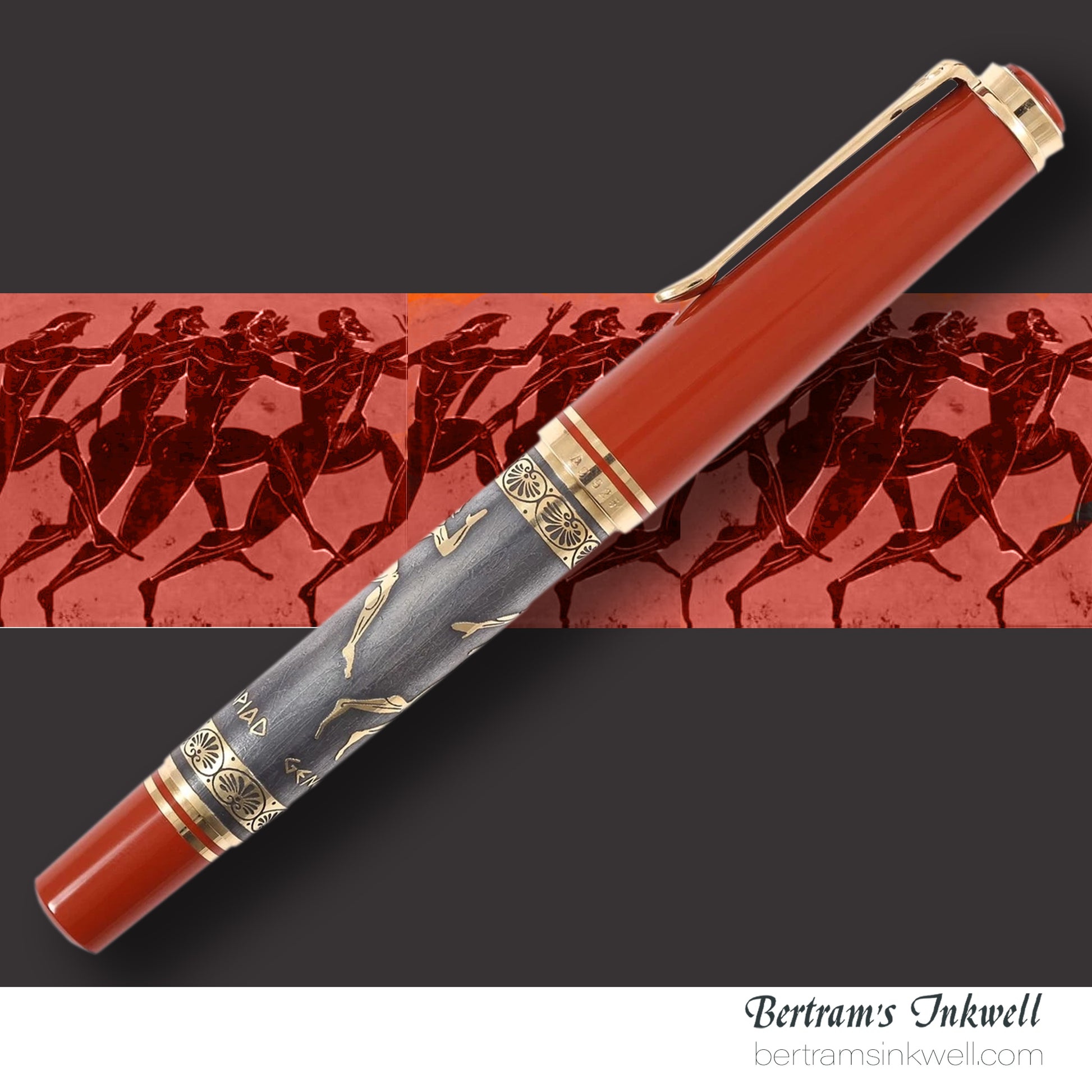 The pen features a depiction of three runners as its motif, which was taken from an historical terracotta amphora. The cap and filler knob of the pen are also terracotta red coloured - giving a nod to the pen's inspiration piece.