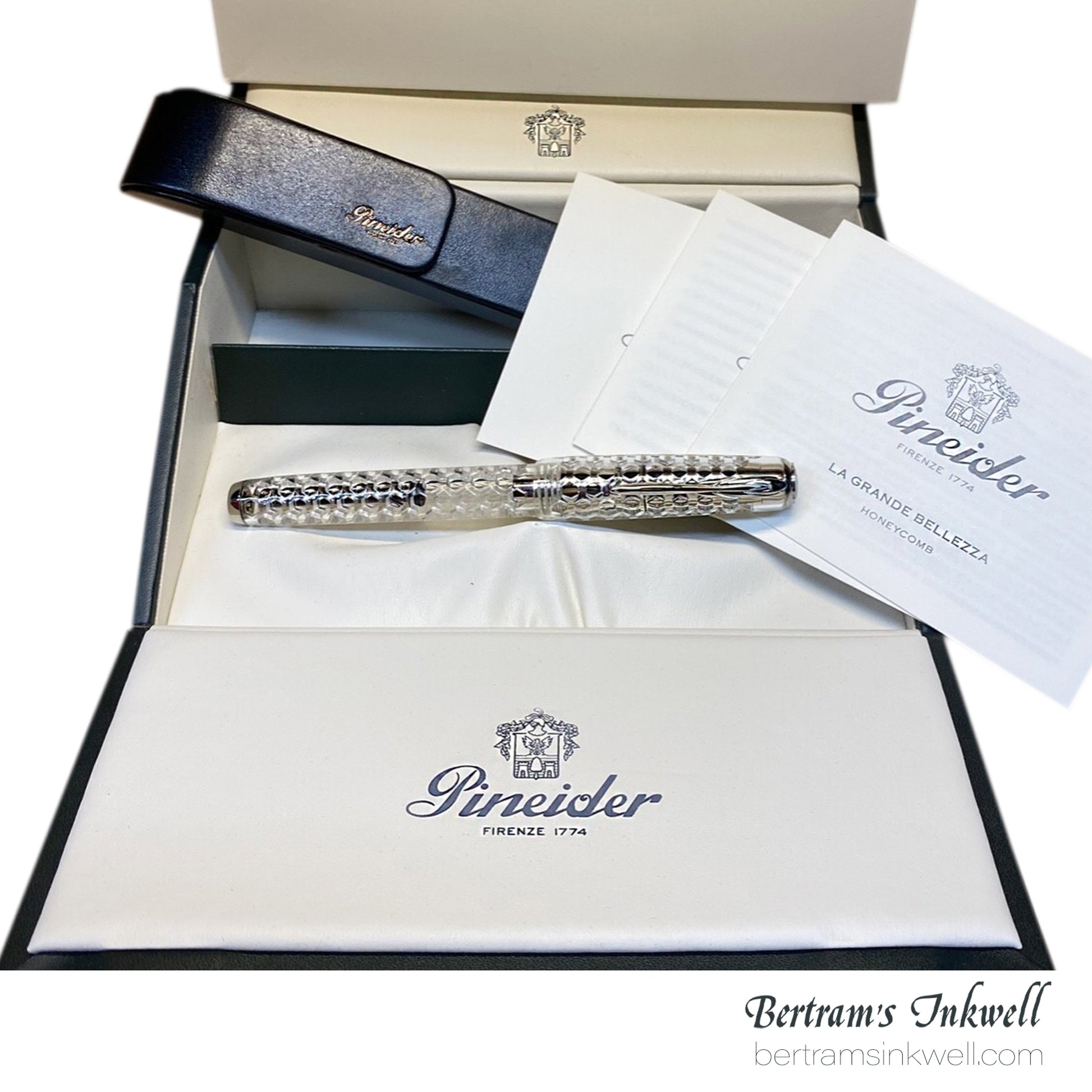 Limited to 888 pieces worldwide, the Honeycomb sports Pineider's 14K Extra Fine quill nib, a perfect nib for bouncy, everyday writing. It arrives in Pineider's green "writing desk" box and a single pen case to protect it.