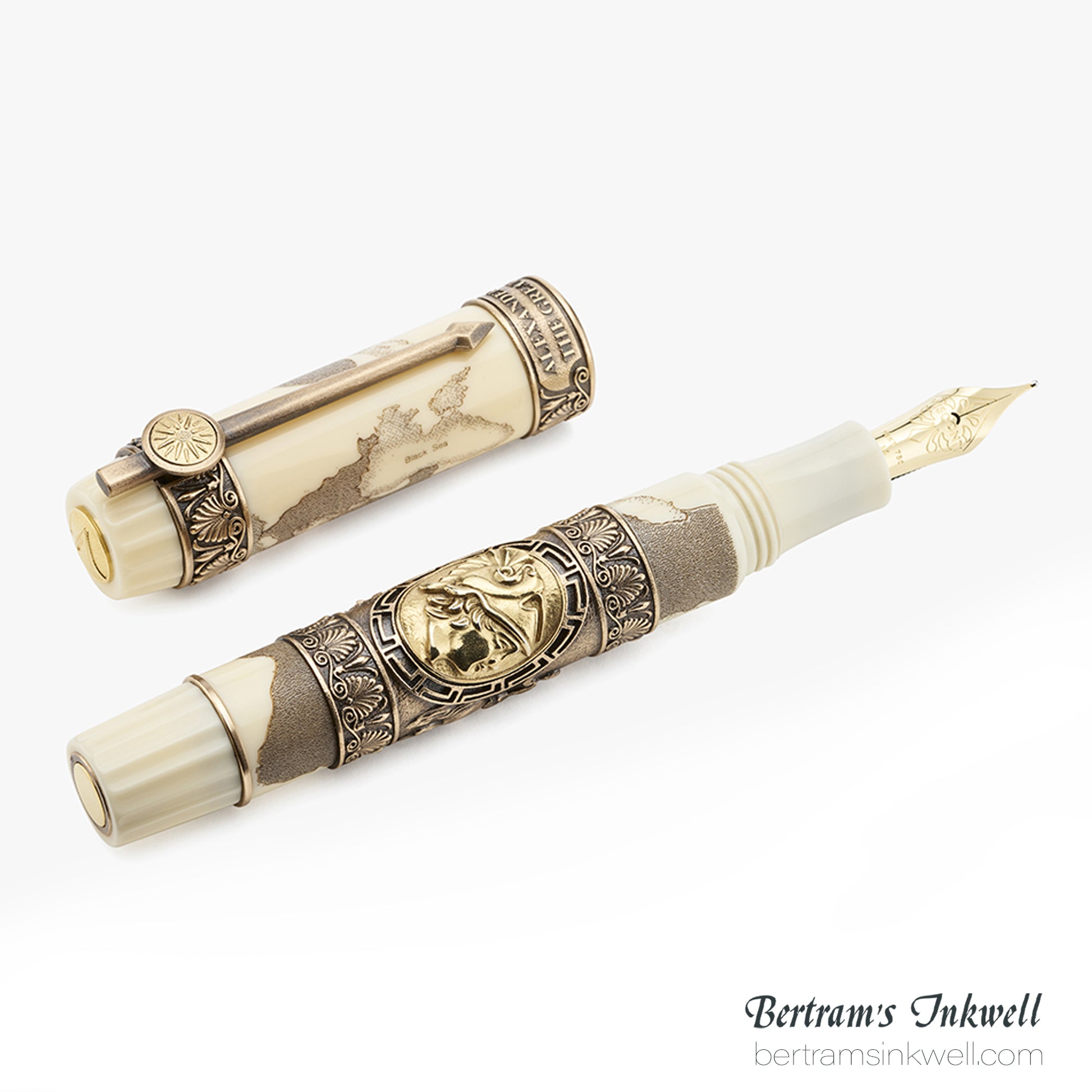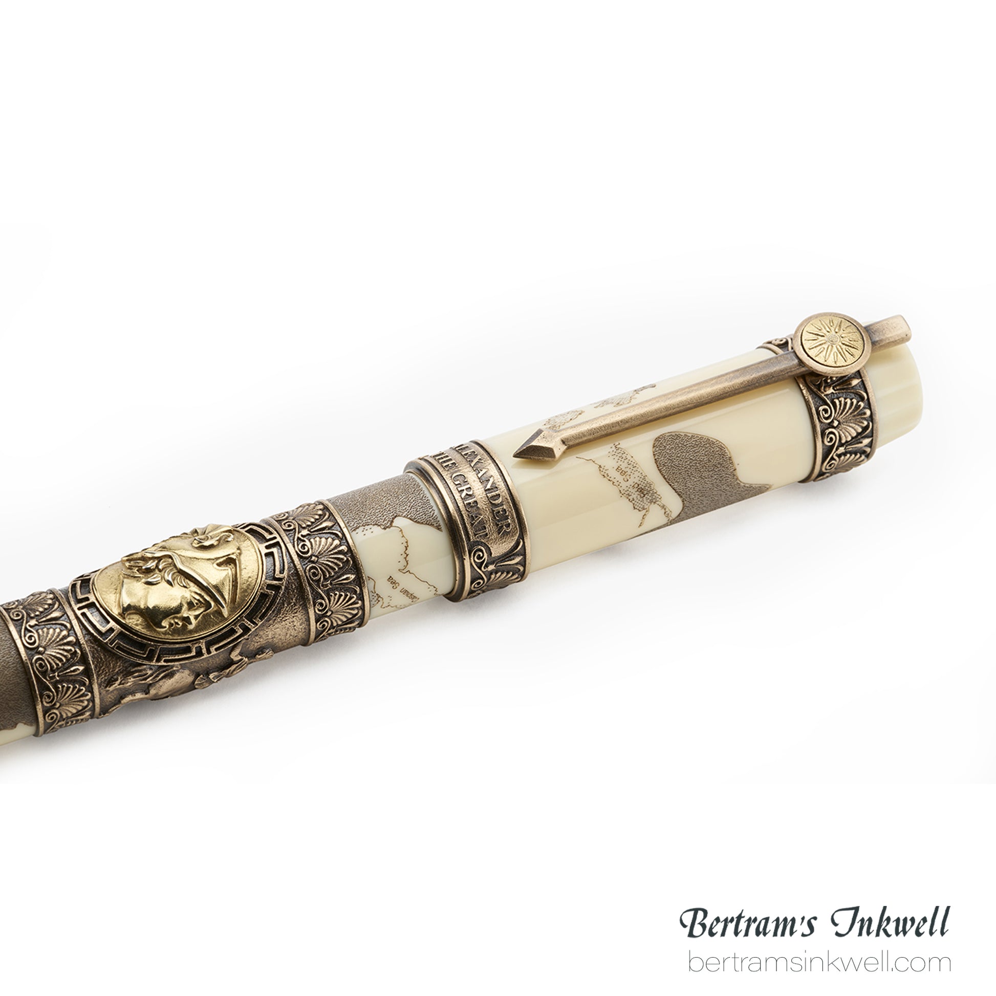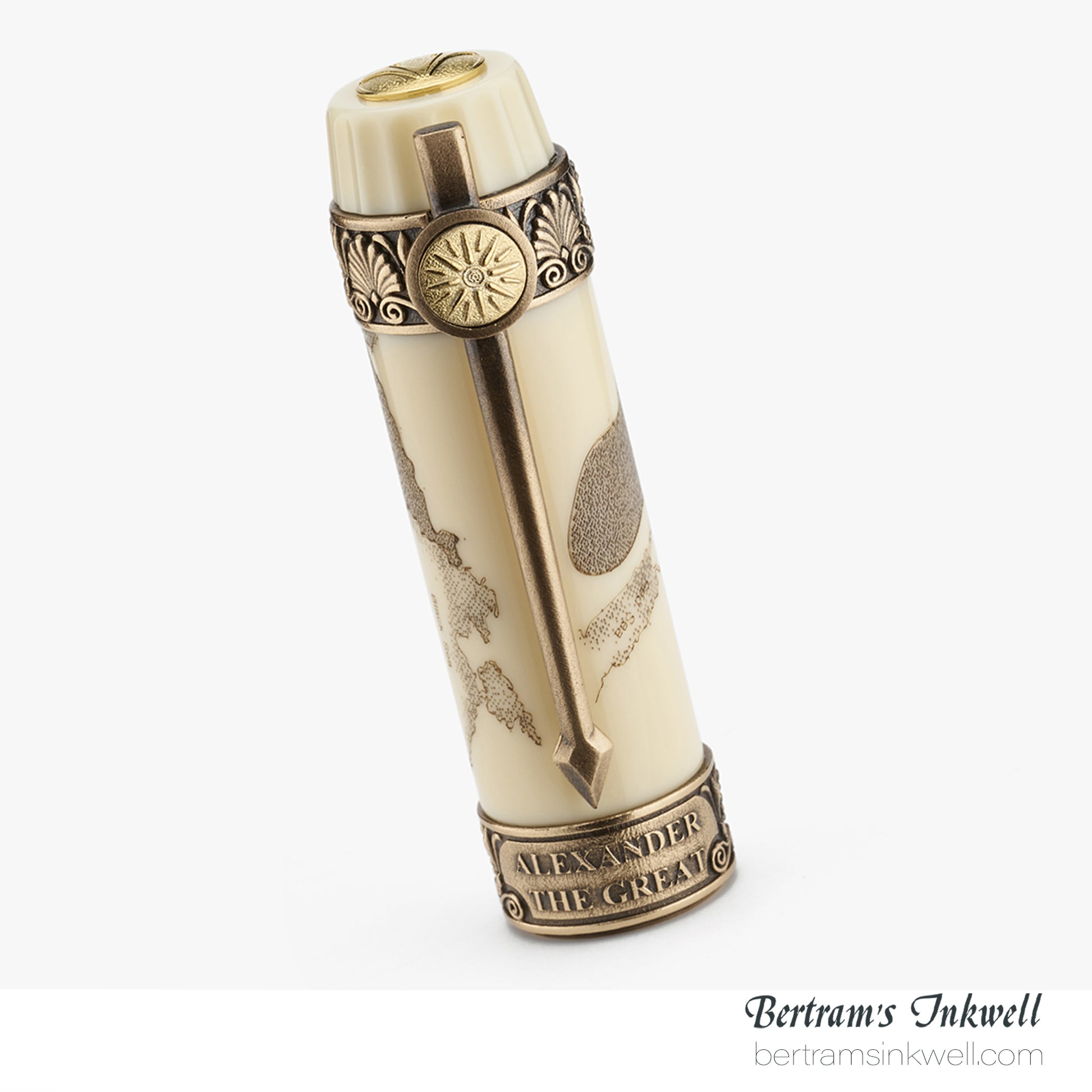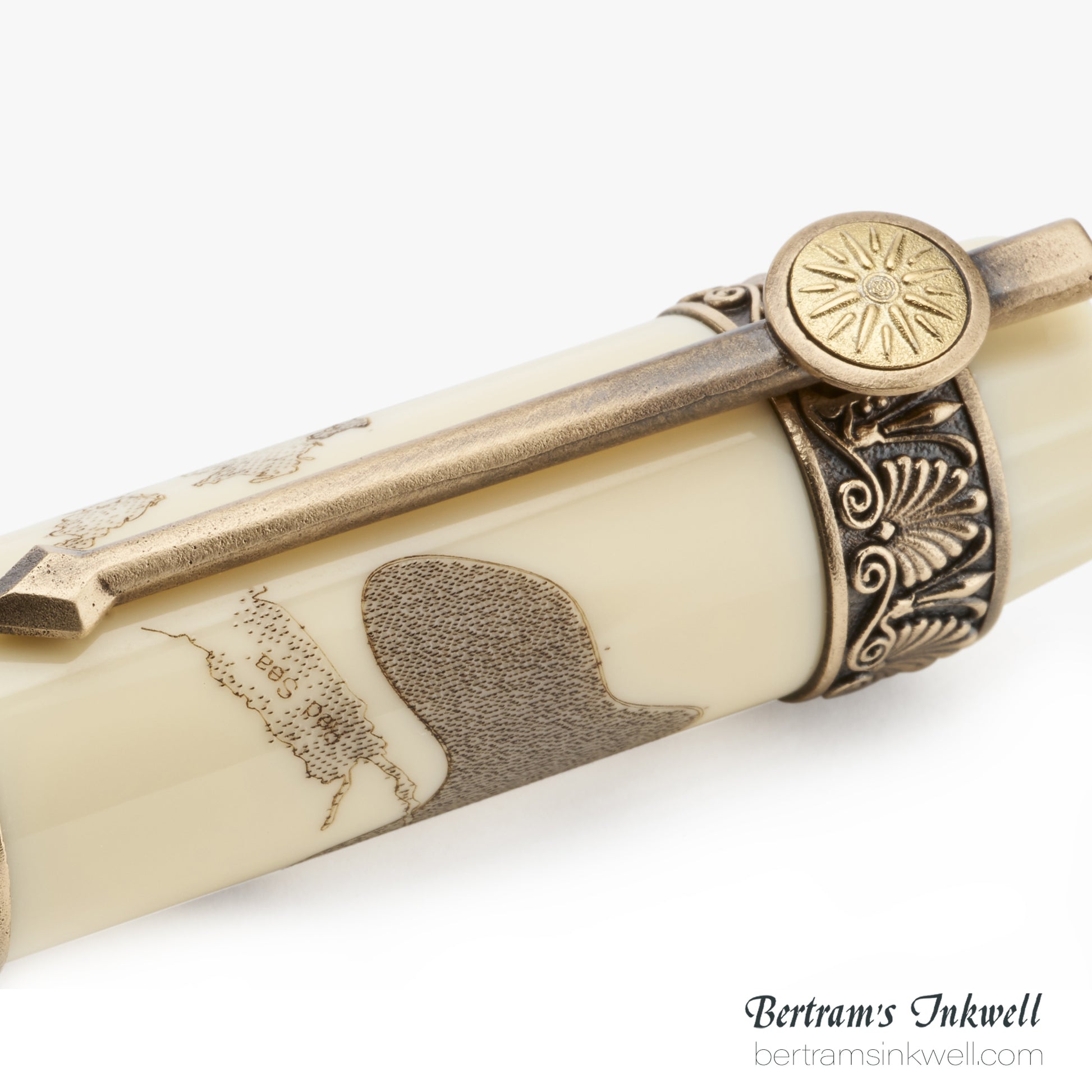 Visconti crafts this incredible collection with a cylindrical shape, including carved details reminiscent of Greek columns. The map of Alexander the Great's empire, created by scrimshaw technique is darkened to make the depiction stand out against the ivory colored resin on the barrel and cap. The metal fittings are in aged bronze and feature typical Greek decorations.