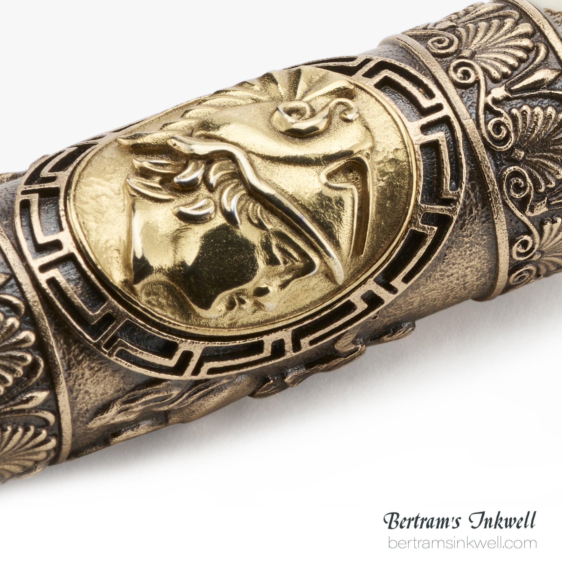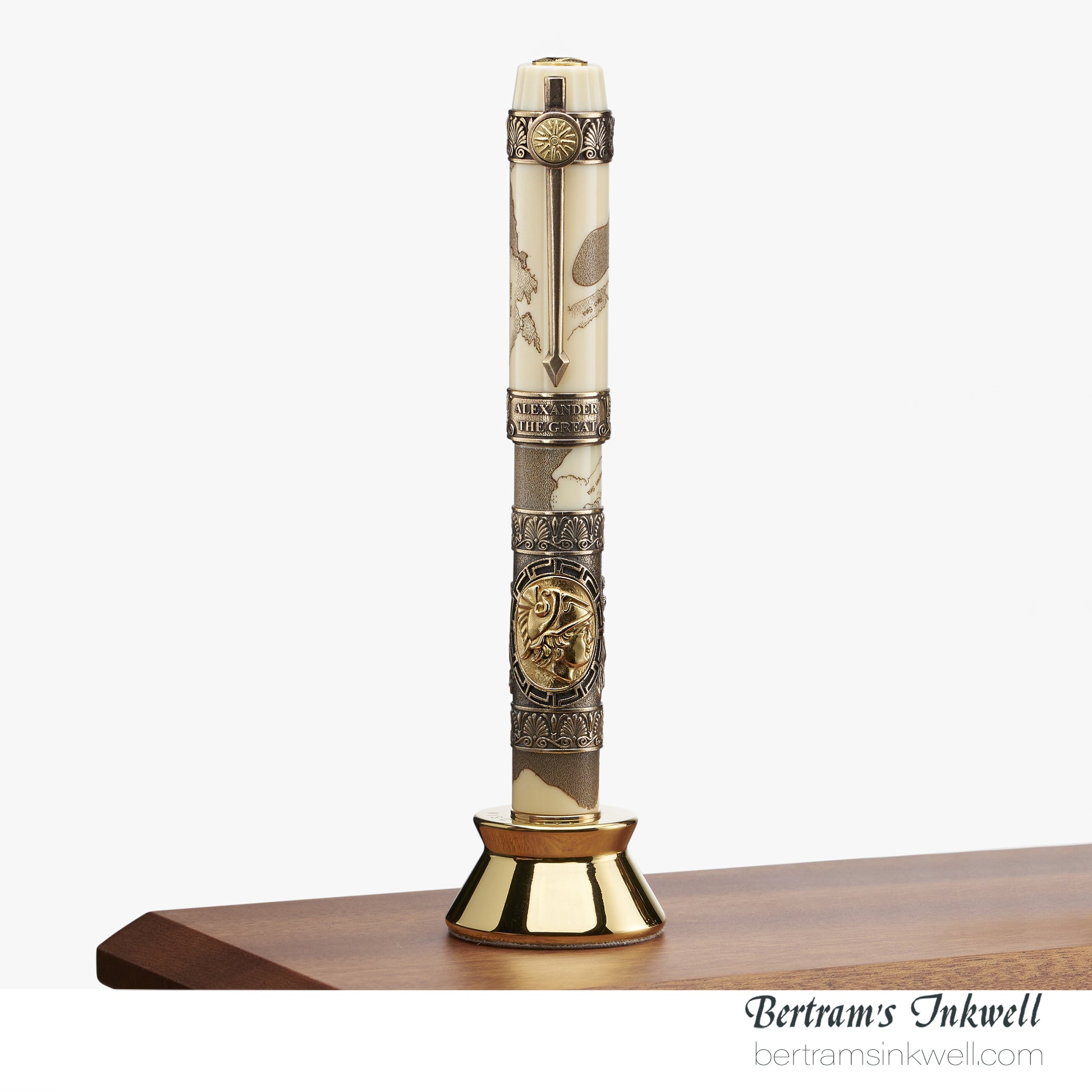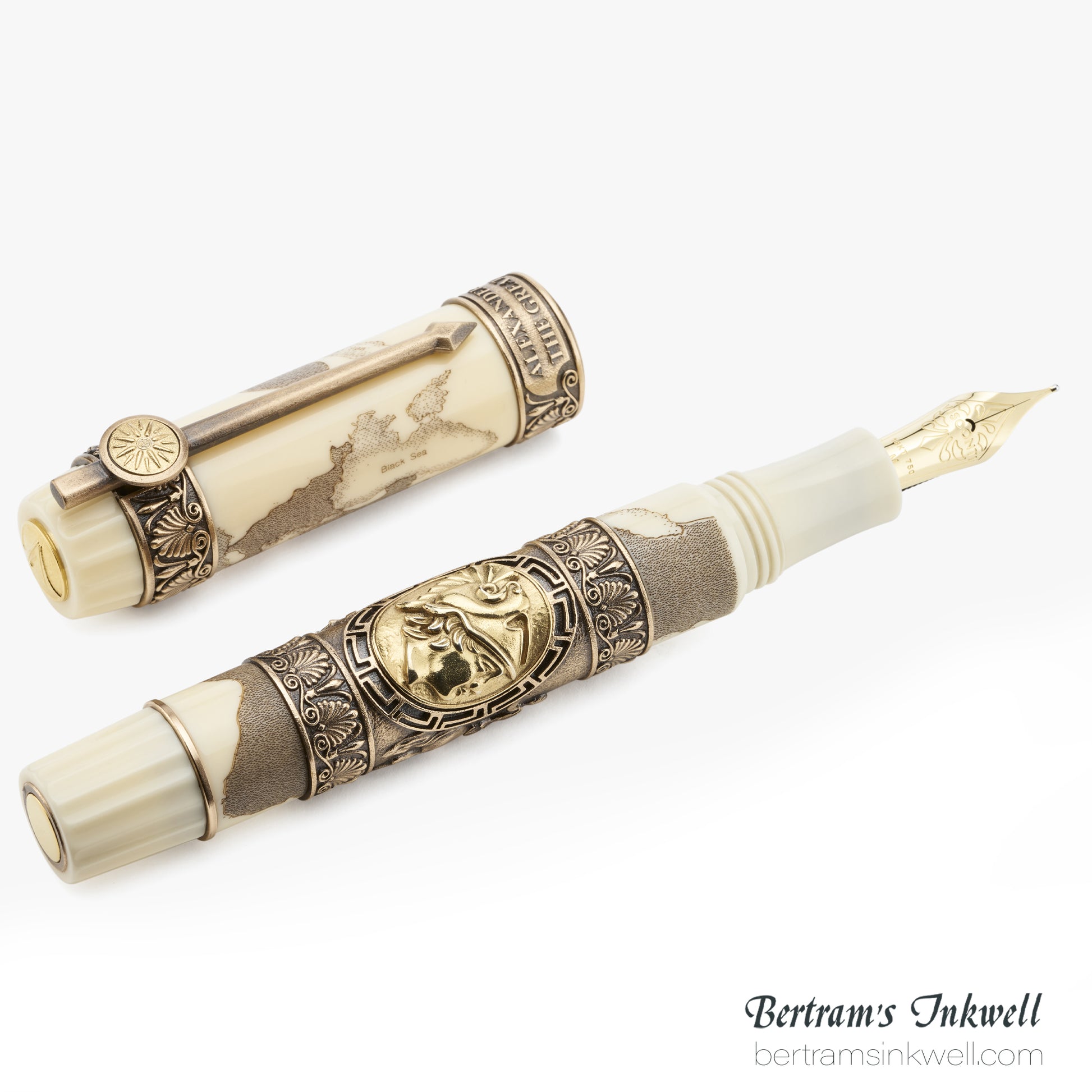 Visconti crafts this incredible collection with a cylindrical shape, including carved details reminiscent of Greek columns. The map of Alexander the Great's empire, created by scrimshaw technique is darkened to make the depiction stand out against the ivory colored resin on the barrel and cap. The metal fittings are in aged bronze and feature typical Greek decorations.
