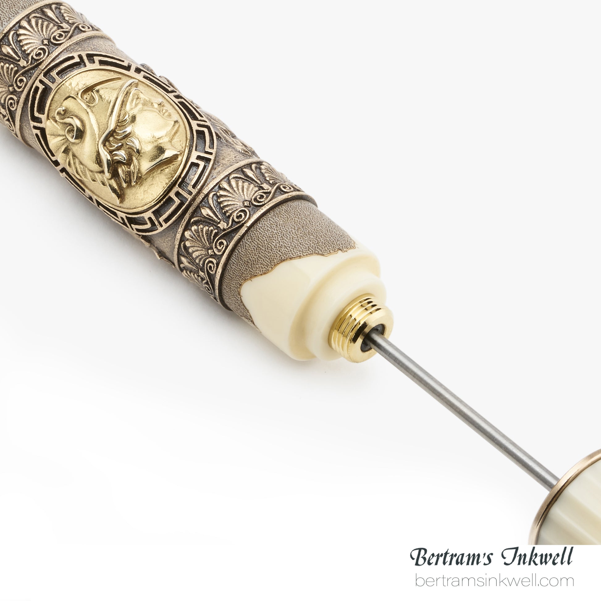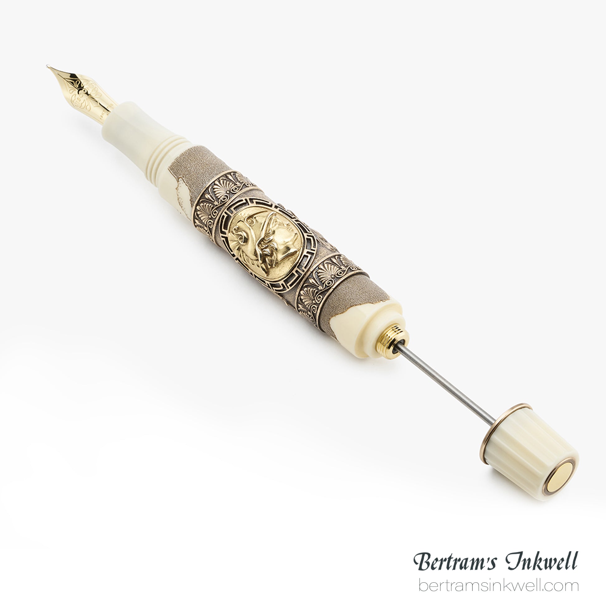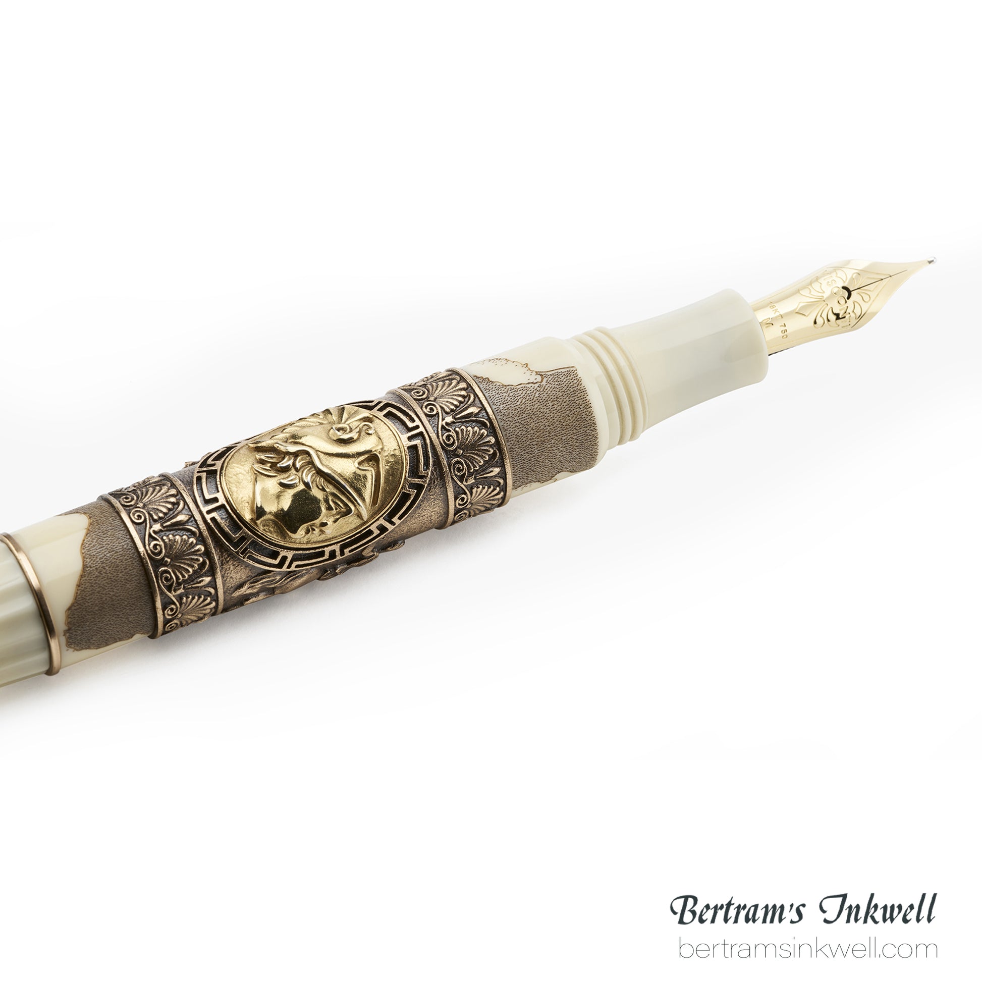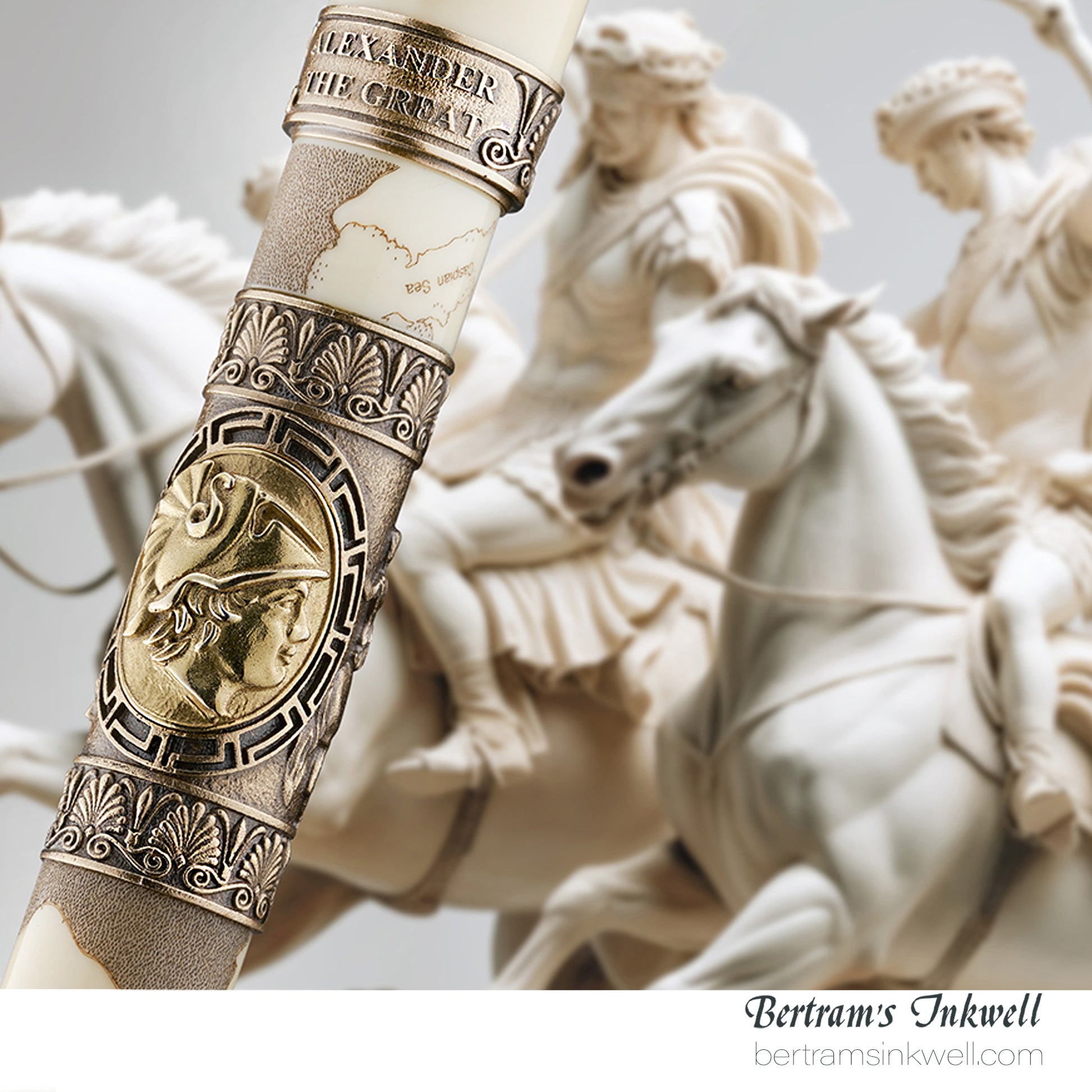 Visconti crafts this incredible collection with a cylindrical shape, including carved details reminiscent of Greek columns. The map of Alexander the Great's empire, created by scrimshaw technique is darkened to make the depiction stand out against the ivory colored resin on the barrel and cap. The metal fittings are in aged bronze and feature typical Greek decorations.