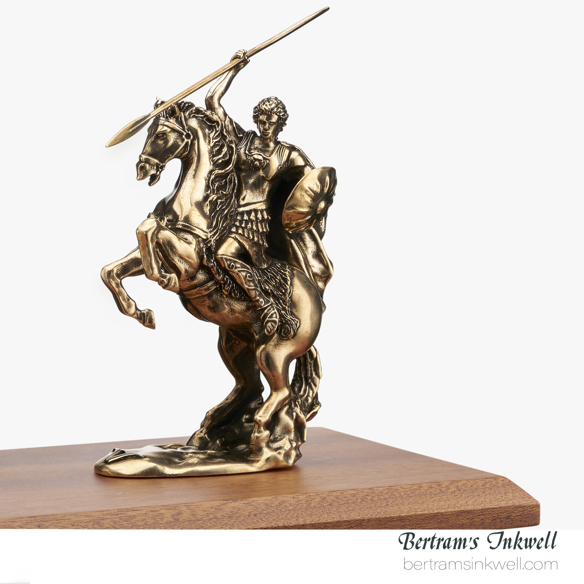 The Alexander the Great is available as a fountain pen and rollerball. The fountain pen features Visconti's famous power filling system with a threaded cap closure and is presented in a magnificent, custom limited edition box depicting Alexander the Great on horseback seemingly in the midst of battle with spear and shield in hand.