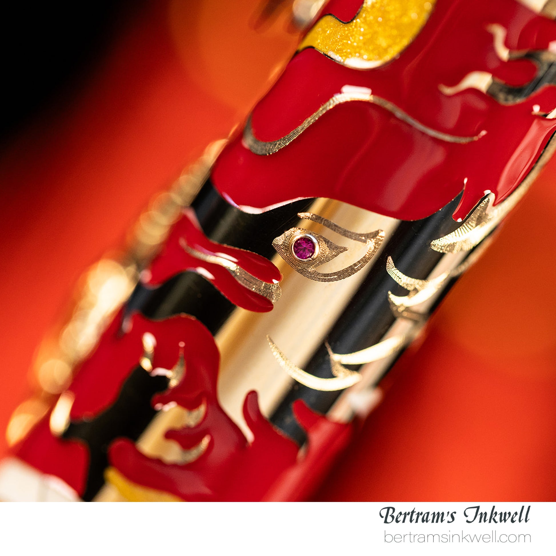 This pen is crafted from gold-plated sterling silver, intricately engraved to depict the shape of an exuberant fie-clawed Chinese dragon proudly standing among a background of small steam clouds. In fact, in Chinese culture, contrary to the West, the dragon is not associated with the element of fire as much as with water, steam, and clouds. Silhouetted against a red background, a traditionally auspicious color, the figure is further accentuated by the adept use of colored enameling and by a finely etched dragon-scale texture visible under a layer of semi-transparent enamel. To emphasize its auspicious power and nobility, Visconti designers decided to further enrich the look of the Imperial Dragon featured on the barrel by setting a precious red ruby in its eye. Even the clip detail was conceived to represent a golden Chinese dragon flying high over the clouds.